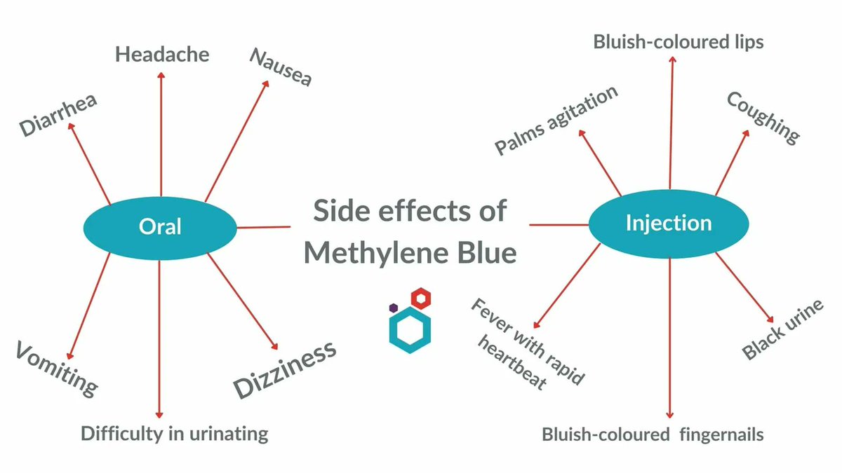 5⃣MB can cause: ❌Hemolytic anemia (in G6PD deficient individuals) ❌Tissue necrosis at injection sites ❌Dangerous blood pressure spikes ❌Heart arrhythmias ❌Oxidative stress (yes, the "antioxidant" becomes a pro-oxidant) The serotonin syndrome risk is REAL. Multiple deaths reported when MB combined with SSRIs/antidepressants. MB acts as an MAOI at higher doses, causing: ❌High fever ❌Muscle rigidity ❌Seizures ❌Potentially fatal neurochemical chaos