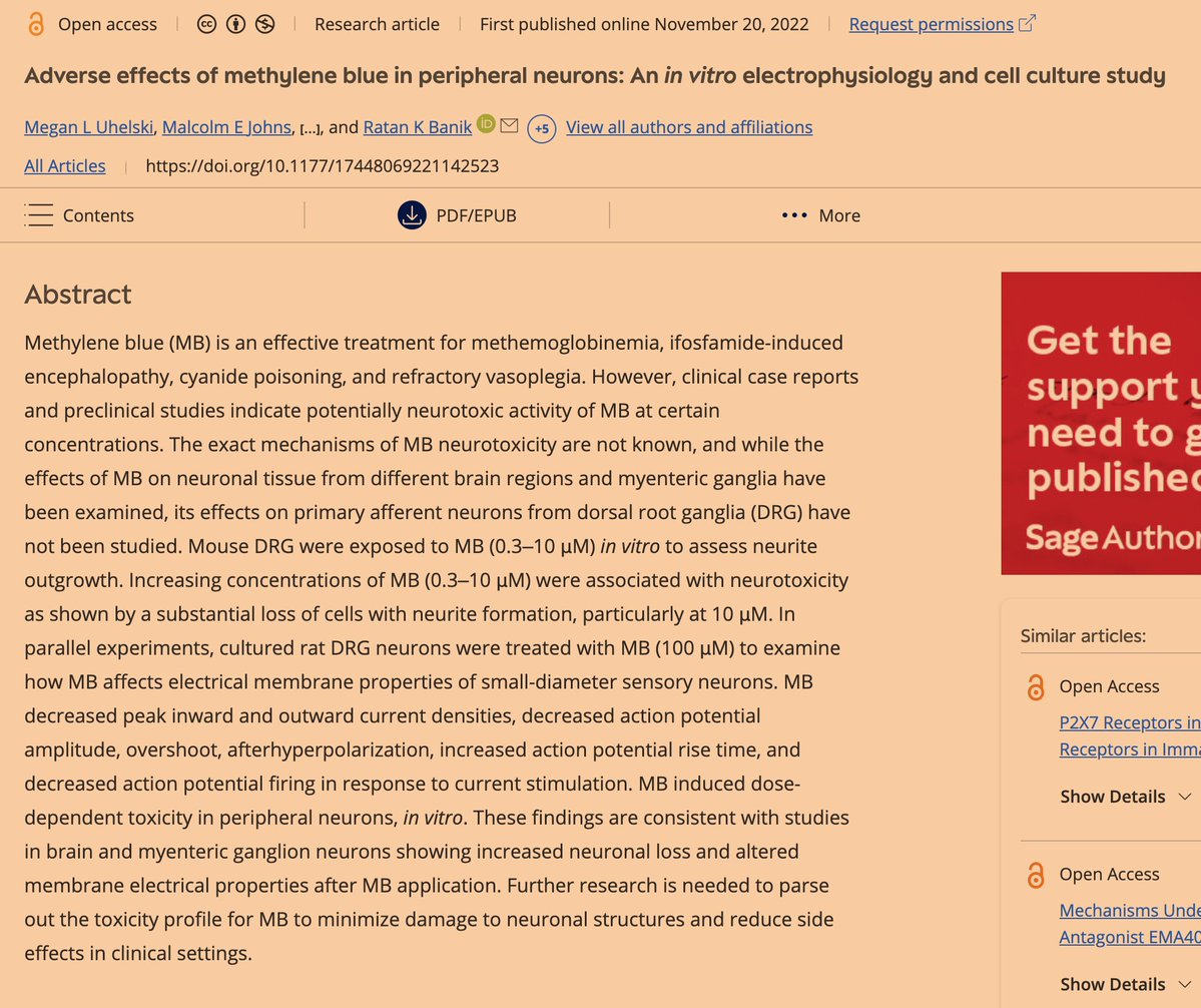 3⃣Methylene blue can harm neurons at relatively low concentrations—but the context matters. Studies show that in neuronal cell experiments (in vitro): ❌ Around 10 µM (≈3.2 µg/mL) can trigger oxidative stress, impair electrical signaling, and cause neurons to lose branches and degenerate. ❌ This is where cells in a dish begin showing measurable toxicity. 👉 What does “damages neurons at 10 µM” mean in plain English? It means that at this concentration, nerve cells start to malfunction, stop communicating properly, and eventually die off in lab experiments. 📏 To give perspective: ❌10 µM = about 0.003 mg per milliliter of fluid. ❌Some MB supplements recommend 0.5–4 mg per dose—but whether that leads to 10 µM levels in the brain depends on absorption, blood-brain barrier penetration, and metabolism. ⚠️ The takeaway: while low-dose MB is often marketed as “brain fuel,” studies remind us that the line between helpful and harmful is thin. Dose, context, and biology matter—and what looks like a nootropic at one level can become a neurotoxin at another. 📍Source: https://journals.sagepub.com/doi/10.1177/17448069221142523