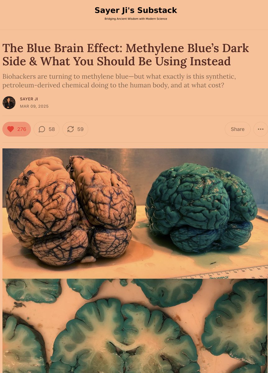 4⃣Here's the most disturbing part: ❌Forensic autopsies of patients given MB show their brains turn BLUE-GREEN after death. ❌The dye accumulates in brain tissue and oxidizes postmortem, revealing just how much has lodged in your neurons while alive. Learn more: https://sayerji.substack.com/p/the-blue-brain-effect-methylene-blues?utm_source=publication-search