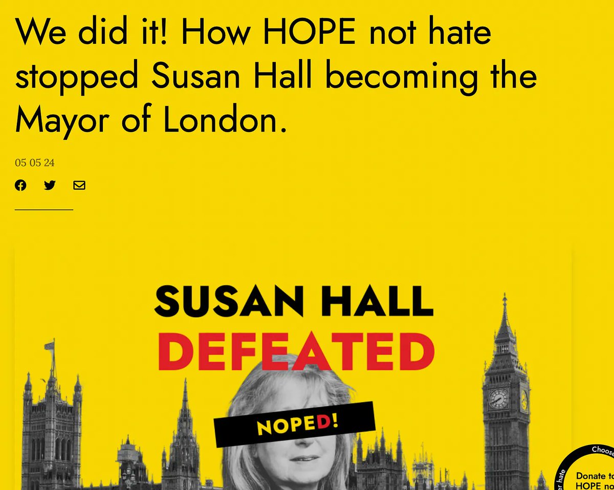 5/ 🚨But Labour Interferes in Their OWN Elections Too The hypocrisy is staggering: while accusing Musk of meddling, Labour-linked groups like CCDH and Hope Not Hate (HNH) have interfered in UK elections: ⁉️Susan Hall’s Mayoral Race: CCDH’s sister NGO, HNH, received funding from the UK’s Counter Extremism Unit, which was used to target Hall. NHN, the same NGO who UK grooming rape gang whistleblower @TRobinsonNewEra exposed, a British taxpayer-funded, government-directed NGO openly took credit for stealing her election chances as detailed below. These groups manipulate elections under the guise of combating "extremism" while crushing dissent. 🧩 Shared Staff: Jemma Levene, former Deputy Director of HNH, is now COO at CCDH. 📖 Full details from @CharlotteCGill : https://www.charlottecgill.co.uk/p/who-funds-you-hope-not-hate-case