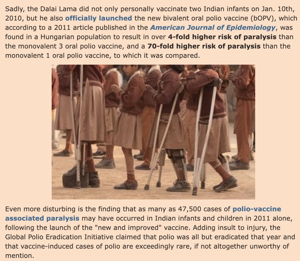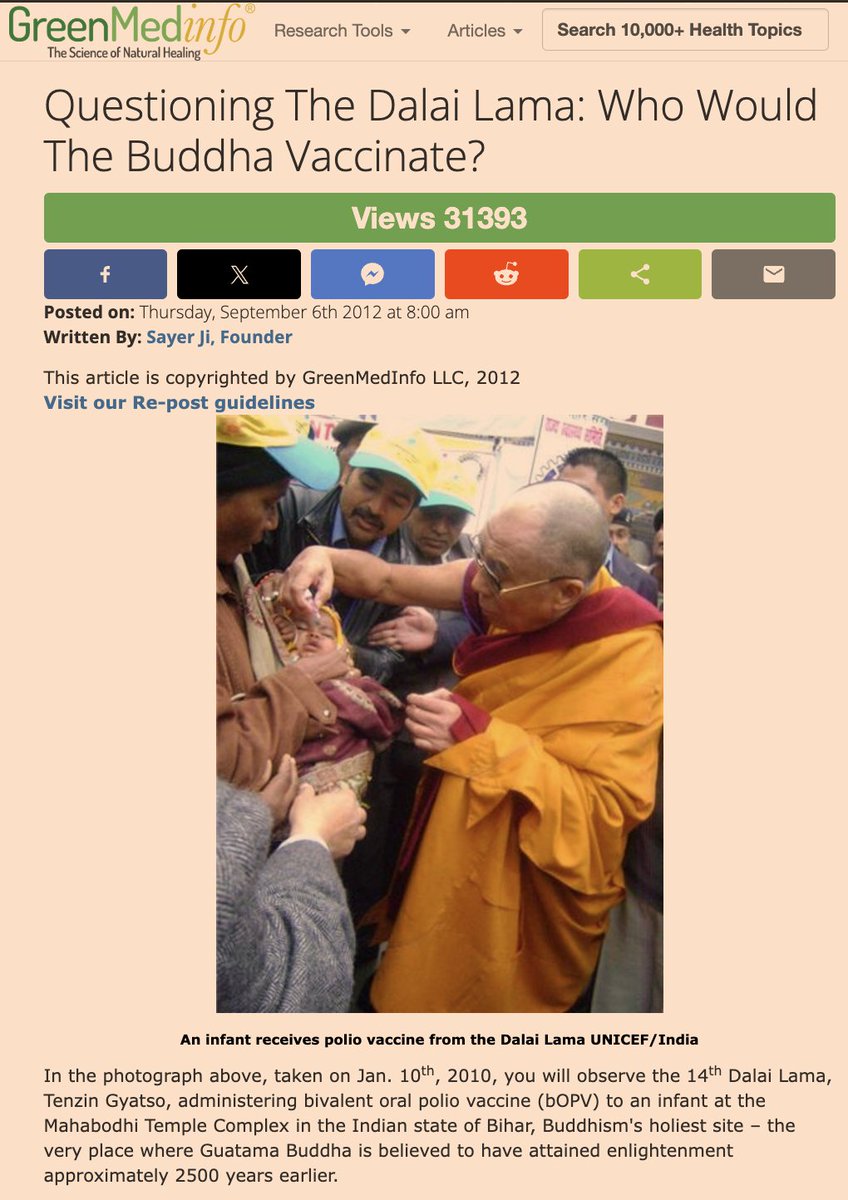 10/ Even the Dalai Lama, a global symbol of compassion, has endorsed and personally gave oral polio vaccines to children in India. But would Buddha advocate for medical mandates, or interventions with unintended, adverse effects without properly informing parents? 🧘♂️💉 Buddhist principles of non-violence and respect for individual suffering invite us to question coercive, and potentially crippling medical interventions. 🌏 Learn more by reading: "Questioning The Dalai Lama: Who Would The Buddha Vaccinate?" https://greenmedinfo.com/blog/questioning-dalai-lama-who-would-buddha-vaccinate1