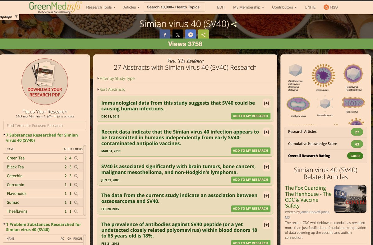 6/ Early polio vaccines were also tainted with SV40, a cancer-causing virus. The CDC’s mysterious removal of their webpage linking SV40 to polio vaccines raises red flags. What else are we not being told? 🕵️ Read "CDC 'Disappears’ Page Linking Polio Vaccines To Cancer-Causing Viruses"https://greenmedinfo.com/blog/cdc-disappears%E2%80%99-page-linking-polio-vaccines-cancer-causing-viruses1 Learn more about SV-40 on http://GreenMedInfo.com's database on the topic: https://greenmedinfo.com/disease/simian-virus-40-sv40