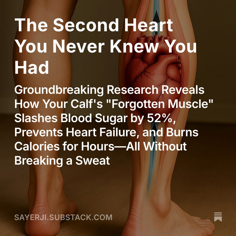 Post 5: The fix is stupidly simple: "Soleus Push-Ups" While seated: 1⃣Keep feet flat, lift heels 2⃣Lower slowly 3⃣Repeat 40-60x/min But there's SO much more to this discovery... Read the full mind-blowing research here: https://sayerji.substack.com/p/the-second-heart-you-never-knew-you