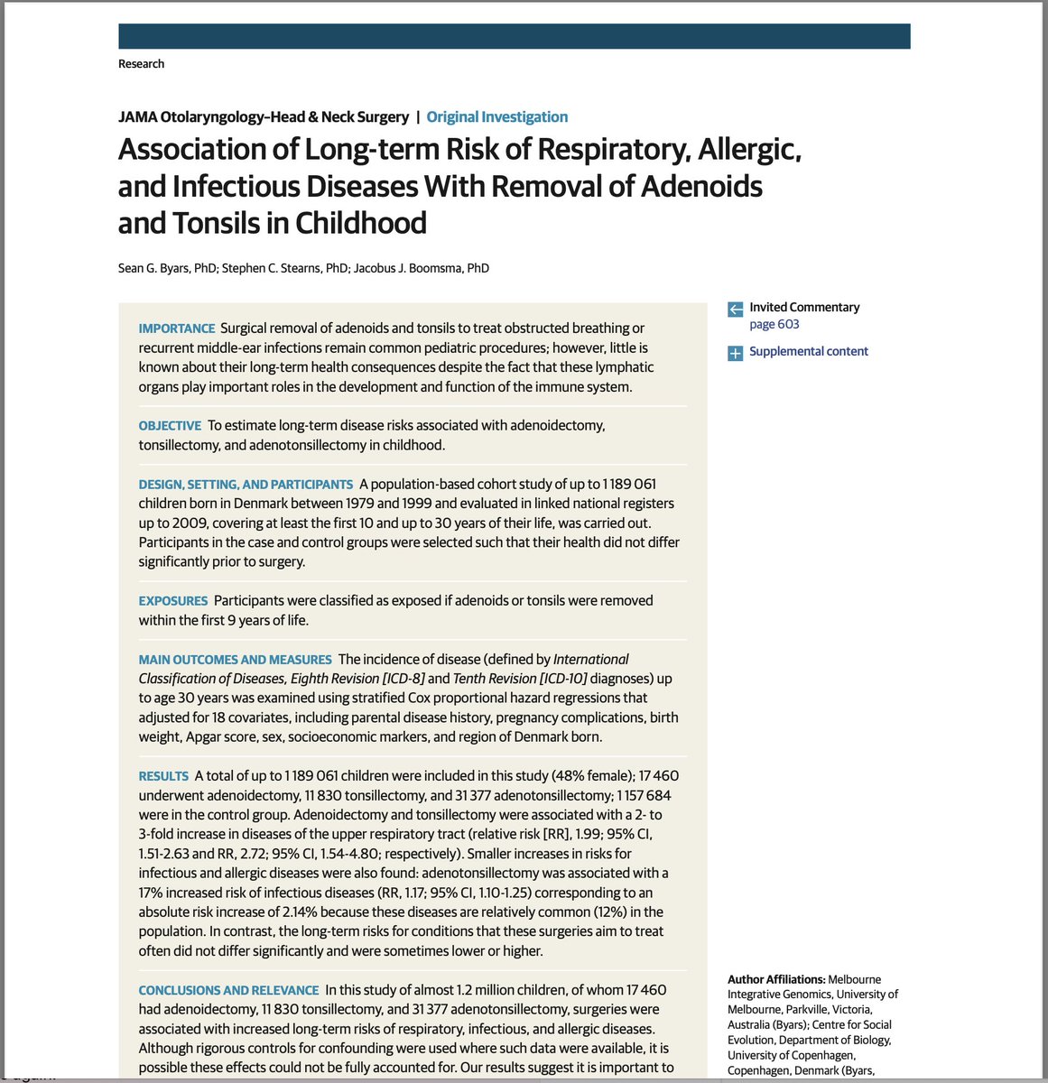 2/ A massive study published in JAMA Otolaryngology analyzed 1.2 million children over 30 years. The results are shocking—children who had their tonsils or adenoids removed faced significantly higher risks of disease later in life! 📑Read the JAMA article here: https://watermark.silverchair.com/jamaotolaryngology_byars_2018_oi_180026.pdf