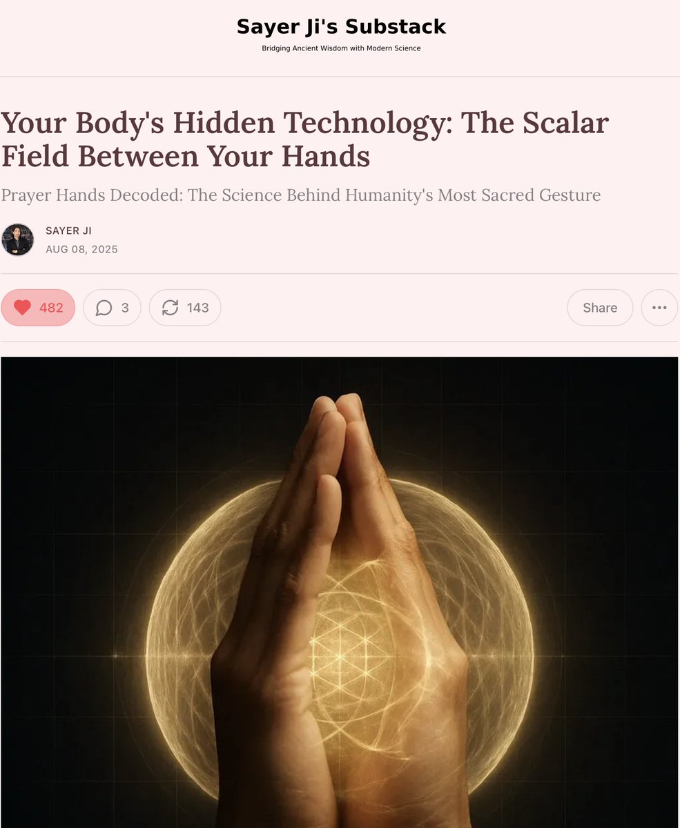 1⃣1⃣The prayer position (hands together) creates a biological phase-conjugate mirror. Left hand = one wave Right hand = opposite phase wave Together = scalar field generation Brain scans show unique coherence patterns when people pray. Coincidence? ✨Learn more about this incredible effect by reading my recent article: https://sayerji.substack.com/p/your-bodys-hidden-technology-the