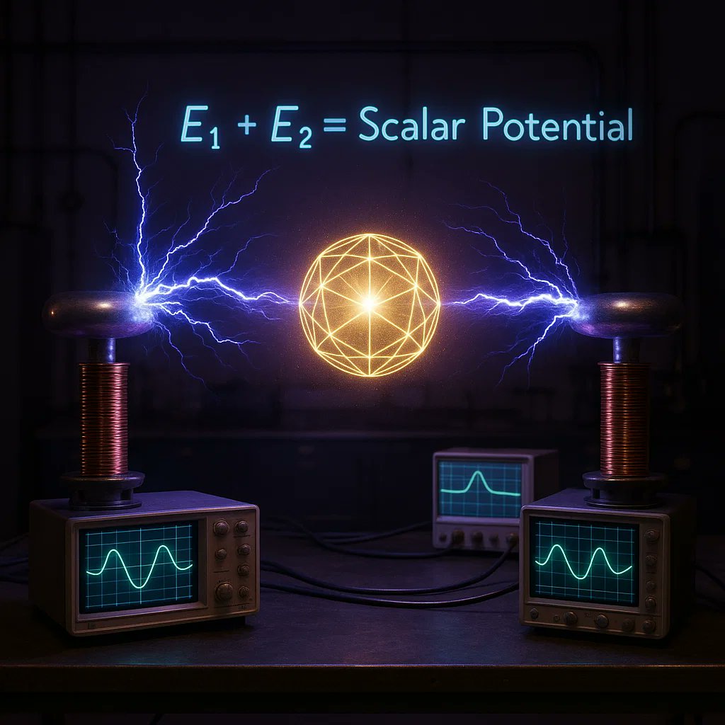 2⃣Here's where it gets wild: When two electromagnetic waves cancel each other out perfectly (180° out of phase), the energy doesn't disappear. It converts into a "scalar wave" - a standing wave of pure potential energy. Think noise-canceling headphones, but for reality itself.