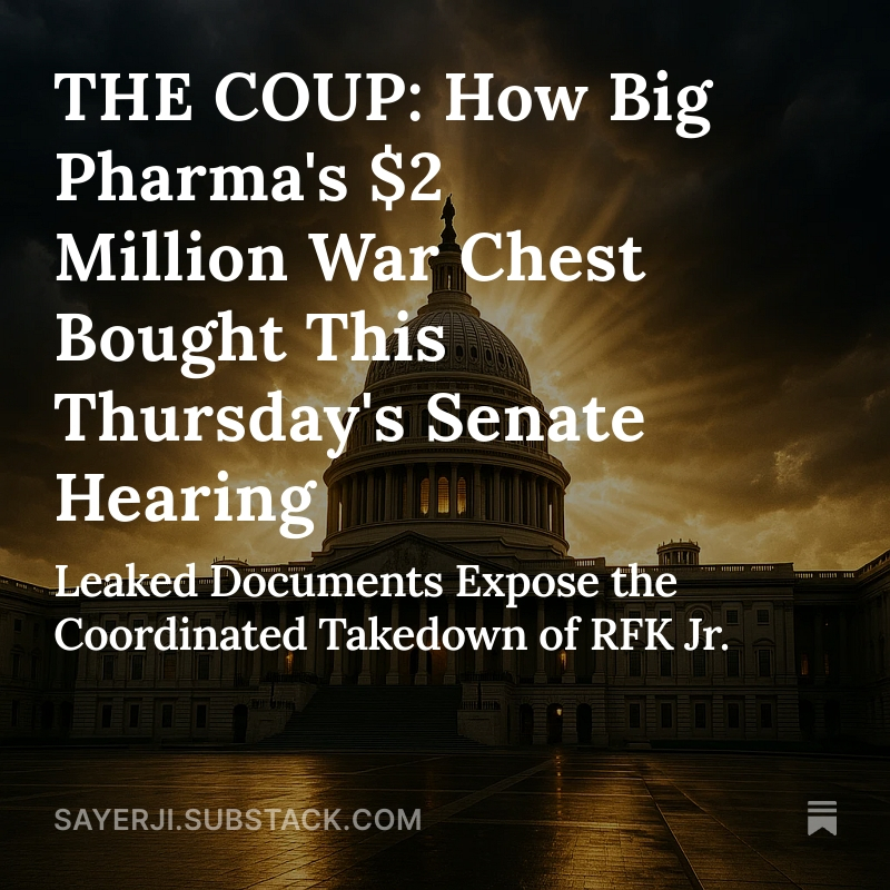 7⃣📖 READ THE FULL EXPOSÉ: https://sayerji.substack.com/p/the-coup-how-big-pharmas-2-million 🇺🇸 TAKE ACTION NOW: Show your support for @SecKennedy today by contacting your Congressmen in ONE EASY STEP below through the health freedom platforms below: 🔹Children's Health Defense: Tell your elected officials you stand with RFK Jr. and MAHA https://childrenshealthdefense.org/community/show-your-support-wear-it-share-it-take-action-and-rally-for-rfk-jr/ @ChildrensHD 🔹 Stand for Health Freedom: Kennedy stood firm—tell your senators you stand with him https://standforhealthfreedom.com/actions/kennedy-firm/ @standforhealth1 Tag, comment, and share this! RT PLEASE! 🚨DIVE DEEP BY READING THE BREAKING EXPOSE: THE COUP: How Big Pharma's $2 Million War Chest Bought This Thursday's Senate Hearing https://sayerji.substack.com/p/the-coup-how-big-pharmas-2-million