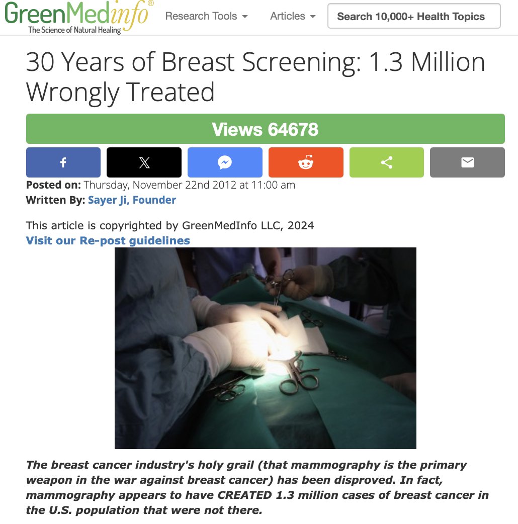 In 2013, the National Cancer Institute admitted millions of "cancers" weren't cancer at all. 1.3 MILLION women unnecessarily treated for breast cancer over 30 years. The medical establishment's response? Crickets 🦗 Learn More: https://greenmedinfo.com/blog/30-years-breast-screening-13-million-wrongly-treated