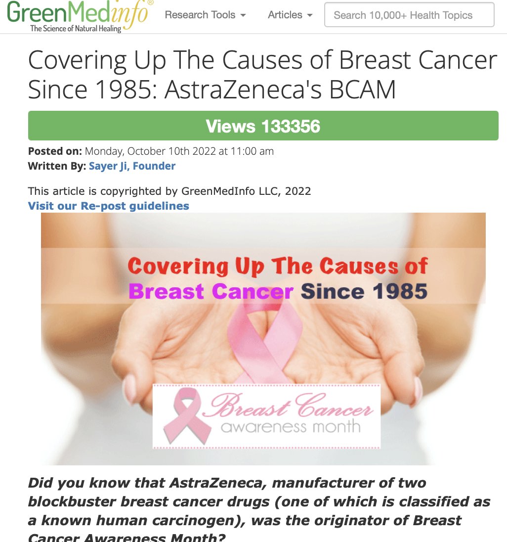 The cancer industry generates $156 BILLION annually. Every mammogram → biopsy → surgery cascade = $73,200 Watchful waiting = $0 When doing nothing pays nothing, guess what they recommend? Learn more about the dark side of BCAM: https://greenmedinfo.com/blog/covering-causes-breast-cancer-1985-astrazenecas-bcam-2