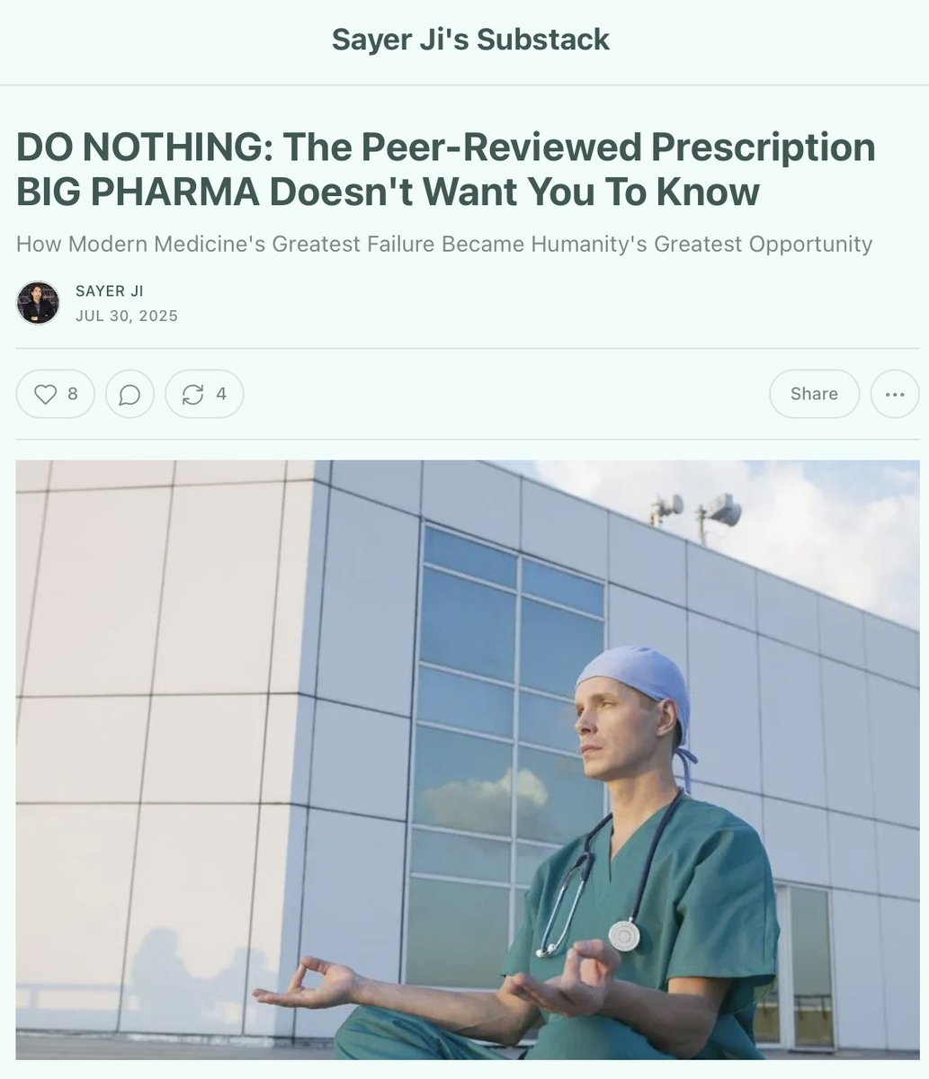 Your body is a 50-trillion-cell quantum symphony that's been perfecting itself for 3.8 billion years. Maybe—just maybe—it knows more about healing than a system that profits from disease. Read the full paradigm-shifting piece: https://sayerji.substack.com/p/do-nothing-the-peer-reviewed-prescription