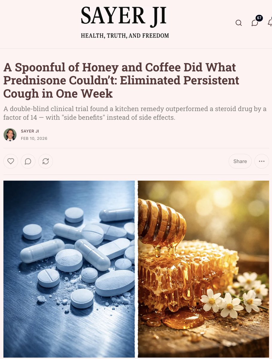 12/ Read my full breakdown — including the deeper science, the mechanisms, and what this means for the food-as-medicine movement — in my latest article: A Spoonful of Honey and Coffee Did What Prednisone Couldn’t: Eliminated Persistent Cough in One Week https://sayerji.substack.com/p/a-spoonful-of-honey-and-coffee-did If you found this valuable, please repost the first tweet. This is the kind of research that deserves to reach every household.