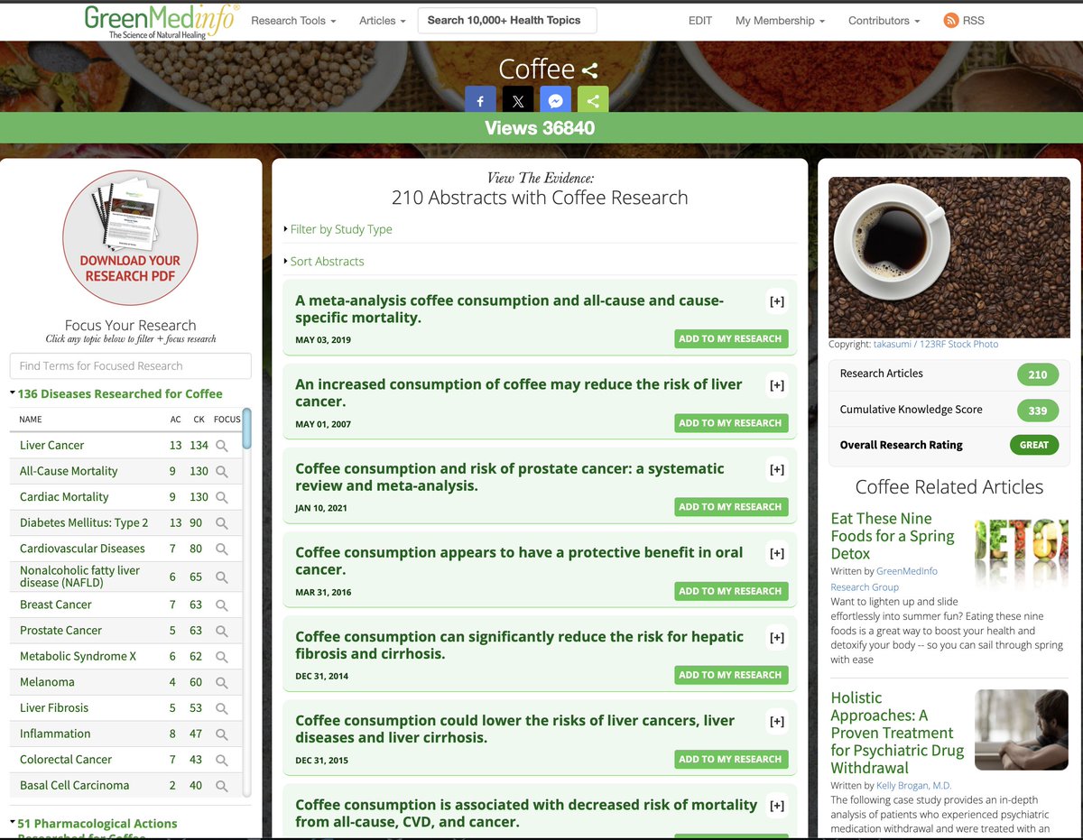 7/ The "side effects" of honey + coffee? Honey: antimicrobial, antioxidant, anti-inflammatory, promotes tissue healing, WHO-recognized demulcent for respiratory conditions. Coffee: natural bronchodilator (contains methylxanthines like theophylline), anti-inflammatory, hypoalgesic. These aren't side effects. They're side BENEFITS. View the full set of therapeutic properties of honey here: https://greenmedinfo.com/substance/honey And coffee here: https://greenmedinfo.com/substance/coffee
