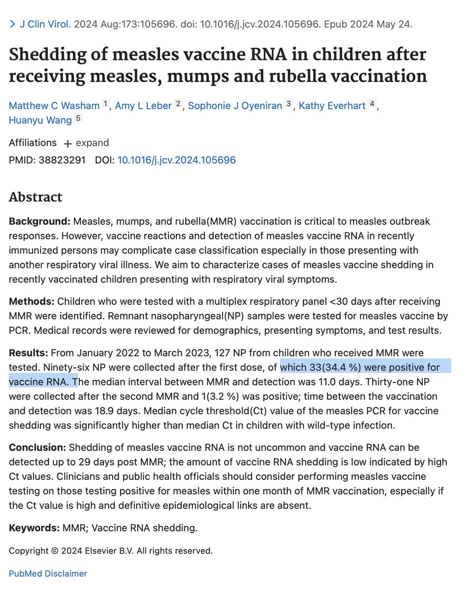 4/7 VIRAL SHEDDING: THE INCONVENIENT TRUTH A 2024 study found measles vaccine RNA in 33% of children up to 4 weeks post-MMR. The vaccine virus is replicating in their respiratory tract. Can it spread? The CDC says "no evidence of transmission." But are we actually looking? Or just assuming? 📕Source: https://pubmed.ncbi.nlm.nih.gov/38823291/