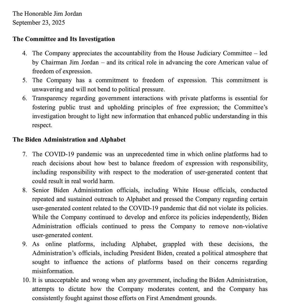 2/ On Sept 23, 2025, Alphabet (Google/YouTube’s parent) finally CONFESSED in writing to @Jim_Jordan: ➡️ The Biden administration pressured them to censor lawful speech. ➡️ They called this pressure “unacceptable and wrong.” 🔥This is the smoking gun.