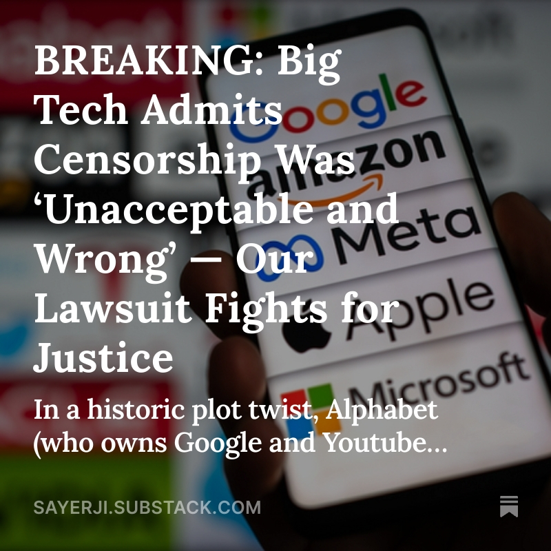 4/ My deep-dive article breaks it all down: 🔎 Alphabet’s confession 🔎 Susan Wojcicki’s chilling brag 🔎 The global censorship-industrial complex 🔎 Why our federal civil rights lawsuit is the road to justice 📖 Read here ➡️ https://sayerji.substack.com/p/breaking-big-tech-admits-censorship