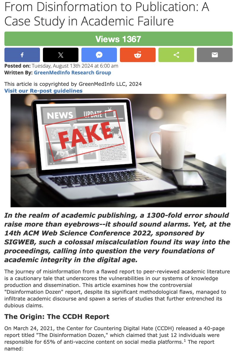 Indeed, these 'researchers' amplified a fake report by CCDH (a UK-US intelligence cutout who laundered civil rights violations on behalf of governments and corporations) which had a 1300 FOLD error, yet it was used by the research community in a dozen or more peer-reviewed and published studies to further crystallize the lies against us: https://greenmedinfo.com/content/disinformation-publication-case-study-academic-failure1