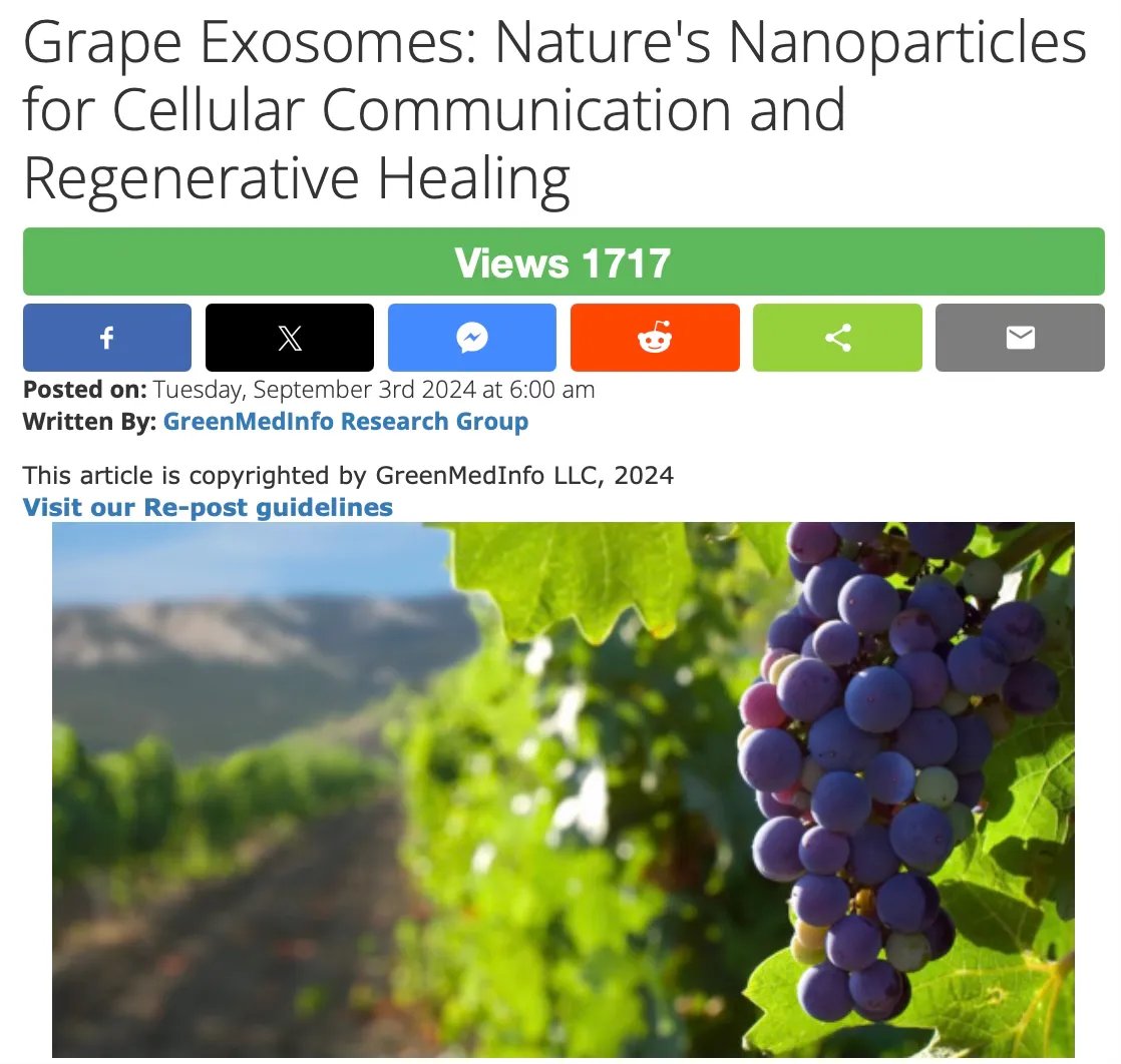 9/But here's what they haven't told you about exosomes: Grape exosomes stimulate intestinal stem cell regeneration. They protect against inflammation. They deliver microRNA instructions that repair damaged tissue. Your body's "infection response" is *literally a healing mechanism*. This isn't metaphorical. Plant-derived exosomes (from grapes) work so effectively that mice treated with them survived *twice as long* when exposed to colitis-inducing toxins. Your body isn't fighting an infection. It's executing a repair protocol. 👉Dive deeper: https://greenmedinfo.com/content/grape-exosomes-natures-nanoparticles-cellular-communication-and-regenerative-h