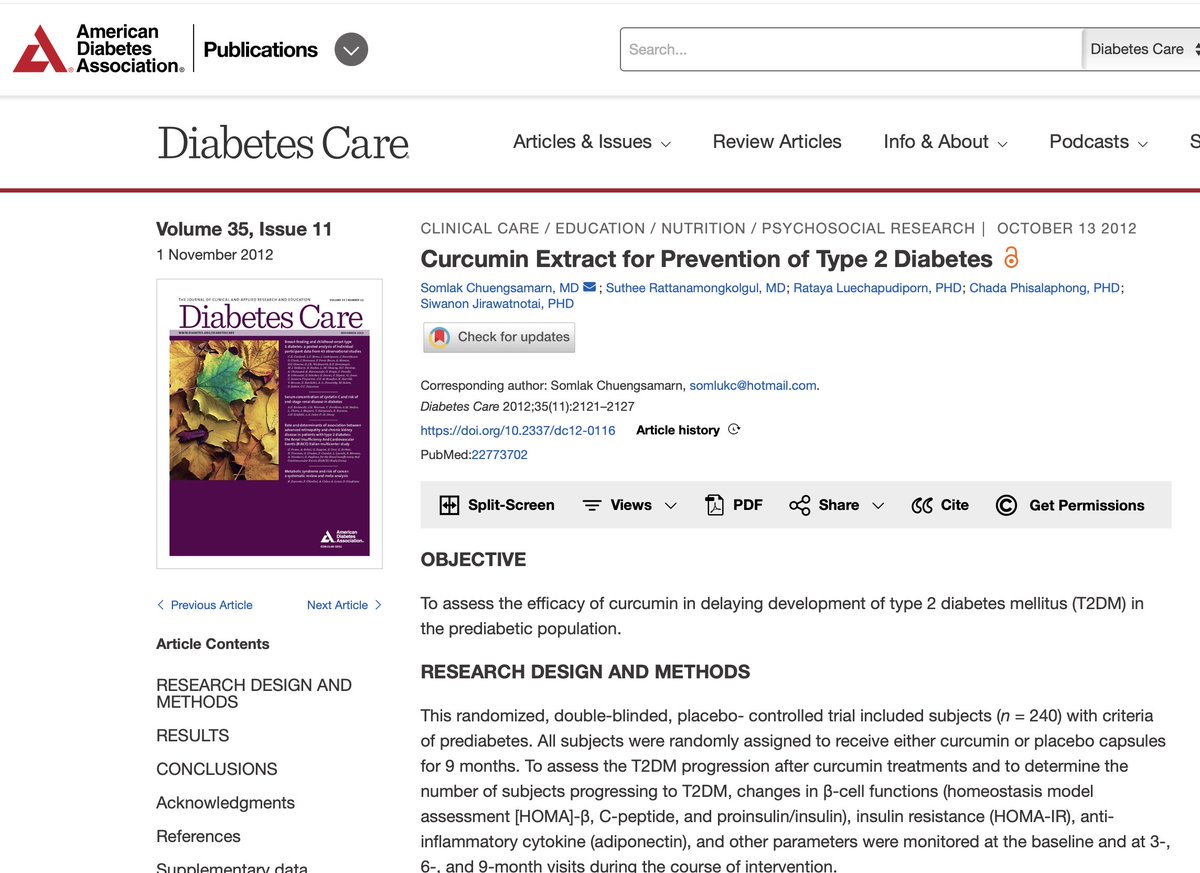 2/ The Study: 240 prediabetic patients in Thailand. Half got curcumin extract (from turmeric), half got placebo. Results after 9 months: 🔶Curcumin group: 0% developed diabetes 🔶Placebo group: 16.4% developed diabetes 🔶Plus: Improved insulin function, reduced inflammation, virtually no side effects. Published in Diabetes Care—the American Diabetes Association's own journal. 🔗https://diabetesjournals.org/care/article/35/11/2121/30921/Curcumin-Extract-for-Prevention-of-Type-2-Diabetes