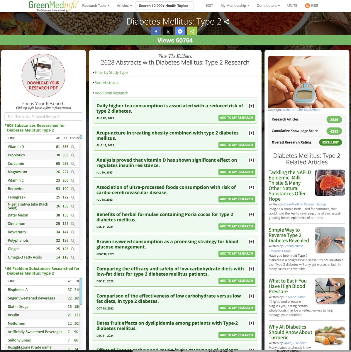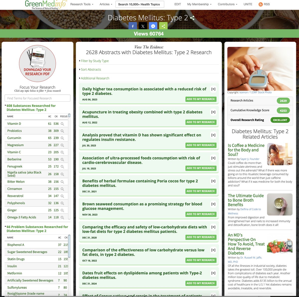 6/The Human Cost: 400+ million people suffer from type 2 diabetes worldwide Standard care = lifelong medication management, not cure What if we prioritized: 🔶Dietary interventions 🔶Herbal compounds 🔶Lifestyle medicine 🔶 Root-cause solutions The potential lives saved and dollars saved? Staggering. 🔗DIVE DEEP INTO HUNDREDS OF TYPE 2 DIABETES SOLUTIONS: https://greenmedinfo.com/disease/diabetes-mellitus-type-2
