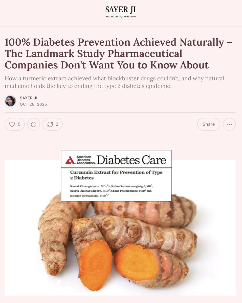 7/The Call to Action: This isn't "alternative" medicine—it's evidence-based medicine suppressed by economic interests. We need: ✓ Public awareness campaigns ✓ Research funding for natural therapies ✓ Regulatory reform ✓ Medical education overhaul Share this thread. Diabetes is preventable, fully reversible. Full article: https://sayerji.substack.com/p/100-diabetes-prevention-achieved @G_W_Forum @standforhealth1 @greenmedinfo @RenzTom @dr_edwardgroup @itsmarlamaples