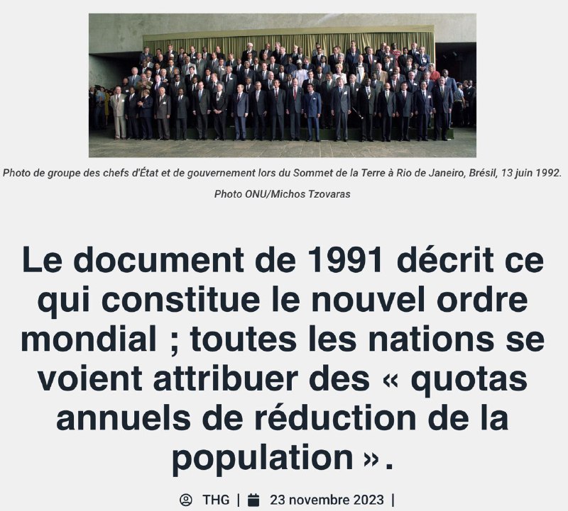 Le saviez-vous ? Le 22 septembre 1991, neuf mois avant le Sommet de la Terre à Rio de Janeiro, une audience publique des Nations Unies sur le Midwest sur l'environnement et le développement s'est tenue à Des Moines, Iowa. Un document issu de cette audition a souligné l'urgence de réduire la population mondiale. "Une réduction immédiate de la population mondiale, conformément aux recommandations du Draper Fund du milieu des années 1970, doit être entreprise immédiatement", indique le document. Le document indique que l'une des mesures à mettre en œuvre est que « toutes les nations établissent des quotas annuels de réduction de la population, qui seront déterminés par le Conseil de sécurité des Nations Unies au moyen d'embargos sélectifs ou totaux sur le crédit, les biens commerciaux, y compris la nourriture et les médicaments, ou , si nécessaire , être appliqué par la force militaire »... Ils ont trouvé d'autres solutions depuis... https://uncutnews.ch/das-dokument-von-1991-beschreibt-was-die-neue-weltordnung-ausmacht-allen-nationen-werden-quoten-zur-jaehrlichen-bevoelkerungsreduzierung-zugewiesen/