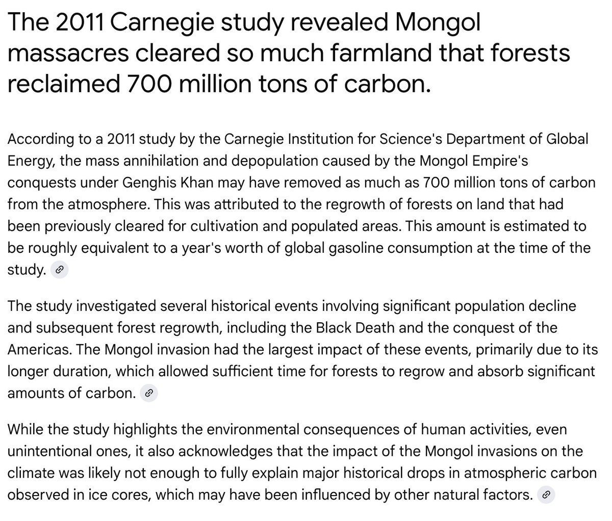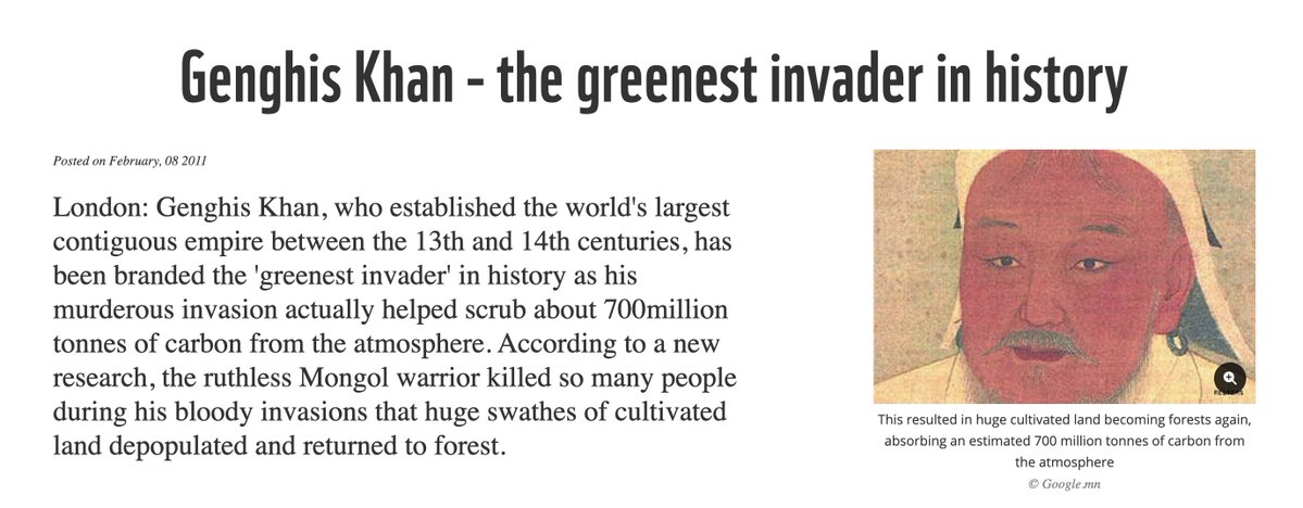 A 2011 WWF study called Genghis Khan "the greenest invader in history." He killed 40 million people (11% of world population) and accidentally cooled the entire planet. Here's how history's greatest mass murderer removed 700 million tons of CO2 🧵