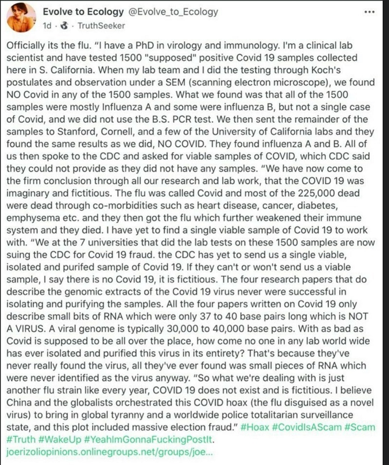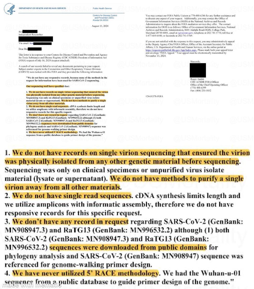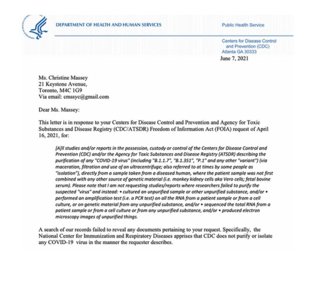 The CDC Confirmed that Covid Virus Has Never Been Isolated‼️ The CDC officially proved there Is no proof of Covid's existence in response to an FOIA request. What was experienced by people starting in 2000 could very well have been the common flu which interestingly disappeared in 2020. Without isolating the virus and then comparing it to what is in diseased tissue and non diseased tissue, we cannot prove that a certain microbe caused a certain disease‼️ On June 7, 2021, the CDC had stated then also that their searches could not find any evidence that Covid-19 had been isolated. Now we know that in August of 2024, that we still have the issue of it not being isolated. This was the key issue with why the data about the Covid-19 coronavirus had not been shared according to Wu Zunyou, the chief epidemiologist at the Chinese Center for Disease Control and Prevention‼️ 🔗👇 https://en.m.wikipedia.org/wiki/Chinese_Center_for_Disease_Control_and_Prevention "No, they didn't isolate the virus. That's the issue."‼️ A member of a lab team with a Phd in virology and immunology, together with her lab team, tested 1500 supposed samples of Covid-19 through Koch's postulates and an SEM microscope in southern california in 2020 and they did not find any covid‼️ @PeacfulGenocide 🔗👇 What they found was influenza A and some were influenza B. The researcher concluded after not finding any evidence of Covid being isolated that, "We have now come to the firm conclusion through all our research and lab work, that the COVID 19 was imaginary and fictitious. The flu was called Covid and most of the 225,000 dead were dead through co-morbidities such as heart disease, cancer, diabetes, emphysema etc. and they then got the flu which further weakened their immune system and they died."‼️🙏👇 Ben @USMortality 🔗👇 John Carleton🔗👇 https://www.johnccarleton.org/BLOGGER/2021/08/07/written-proof-cdc-has-no-isolated-purified-sample-of-sars-cov-2-virus-that-causes-covid-19/ Journal of Medical Virology🔗👇 https://www.ncbi.nlm.nih.gov/pmc/articles/PMC7166628/ Credit 💫 CovidVaccineAdverseReactions💥