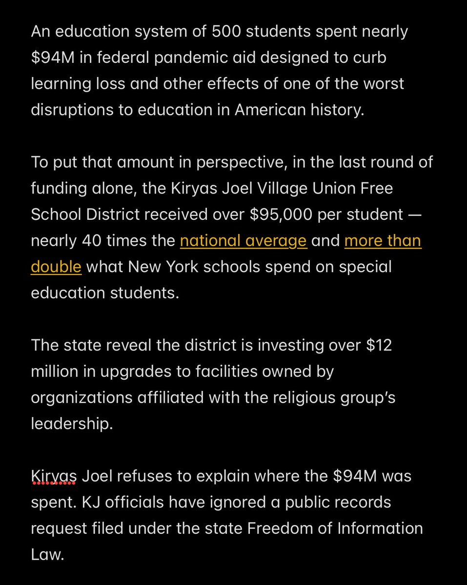 They do this through gaming the system, extracting taxpayer dollars for their own benefit. They take in more welfare than the poorest parts of the Bronx, but they arenโt actually poor, just on paper. For example, the town school district extracted $94M in federal pandemic aid. https://t.co/stiB6rr9eA