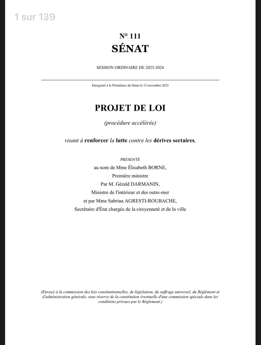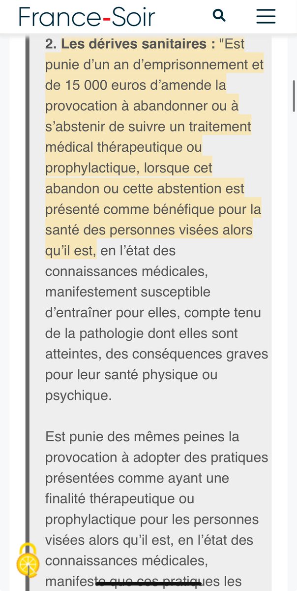 Pour ceux qui nâont toujours pas compris quâils ne veulent rien laisser au hasard Ă la prochaine plandĂ©mie lisez le projet de loi prĂ©sentĂ© en lecture accĂ©lĂ©rĂ©e qui porte de 1 Ă 3 ans dâemprisonnement la provocation Ă abandonner ou Ă s'abstenir de suivre un traitement mĂ©dical thĂ©rapeutique ou prophylactique, lorsque cet abandon ou cette abstention est prĂ©sentĂ© comme bĂ©nĂ©fique pour la santĂ© des personnes visĂ©esâ https://senat.fr/leg/pjl23-111.pdf