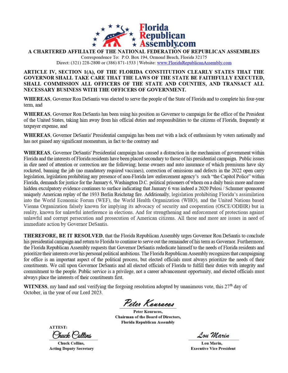 #Florida Republican Assembly passed a resolution to RECALL GOV DESANTIS BACK HOME TO DO HIS JOB! “We elected our Governor to a 4-year term to take care of Florida. NOT PAY HIM TO CAMPAIGN for higher office.” https://t.co/gwcjiPRDBy