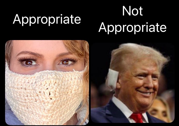 One is afraid of a virus with a 98% recovery rate and wearing a crocheted mask… it’s appropriate The other was just sh0t in the head and was nearly assass’nated… but a bandage is not appropriate. Liberal logic at its finest! #TrumpAssasinationAttemptFoiled #TrumpAssassinationAttempt #Trump2024