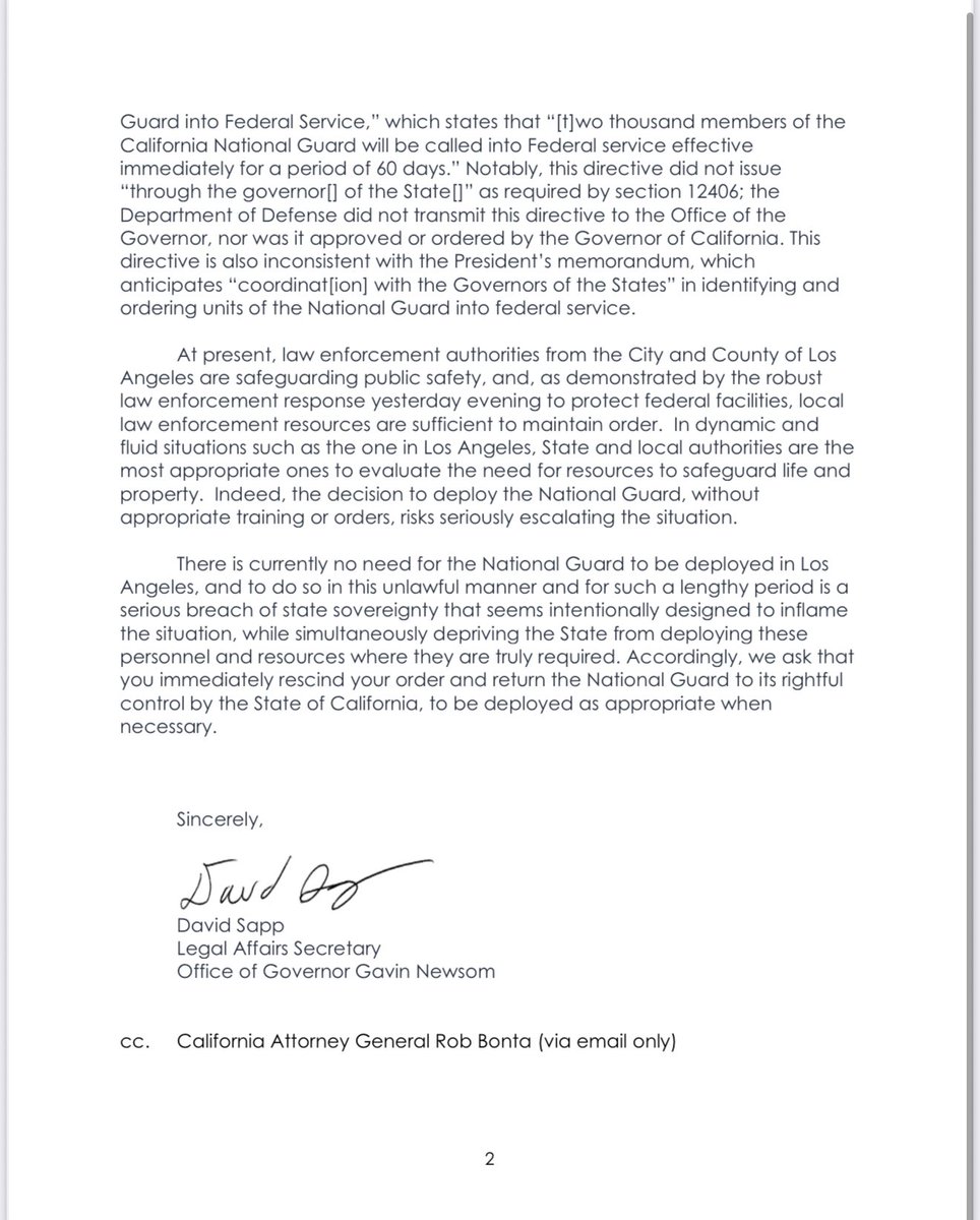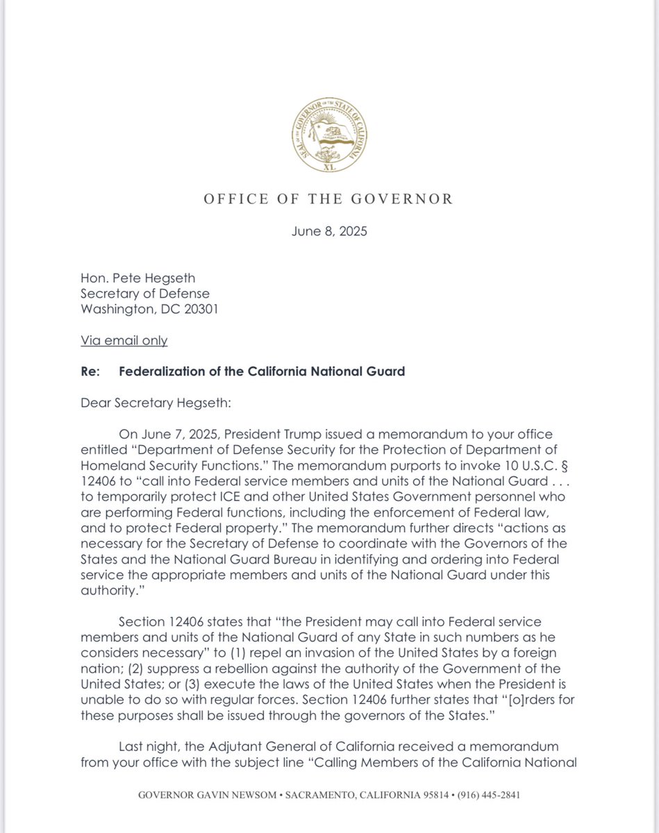 Translation: I have formally requested the President stop enforcing federal law in CA. In the Golden State, we embrace lawlessness. We welcome rioters & looters, & we want even MORE illegal aliens & gang members. We handcuff our police & celebrate our criminals. And we hate 🇺🇸