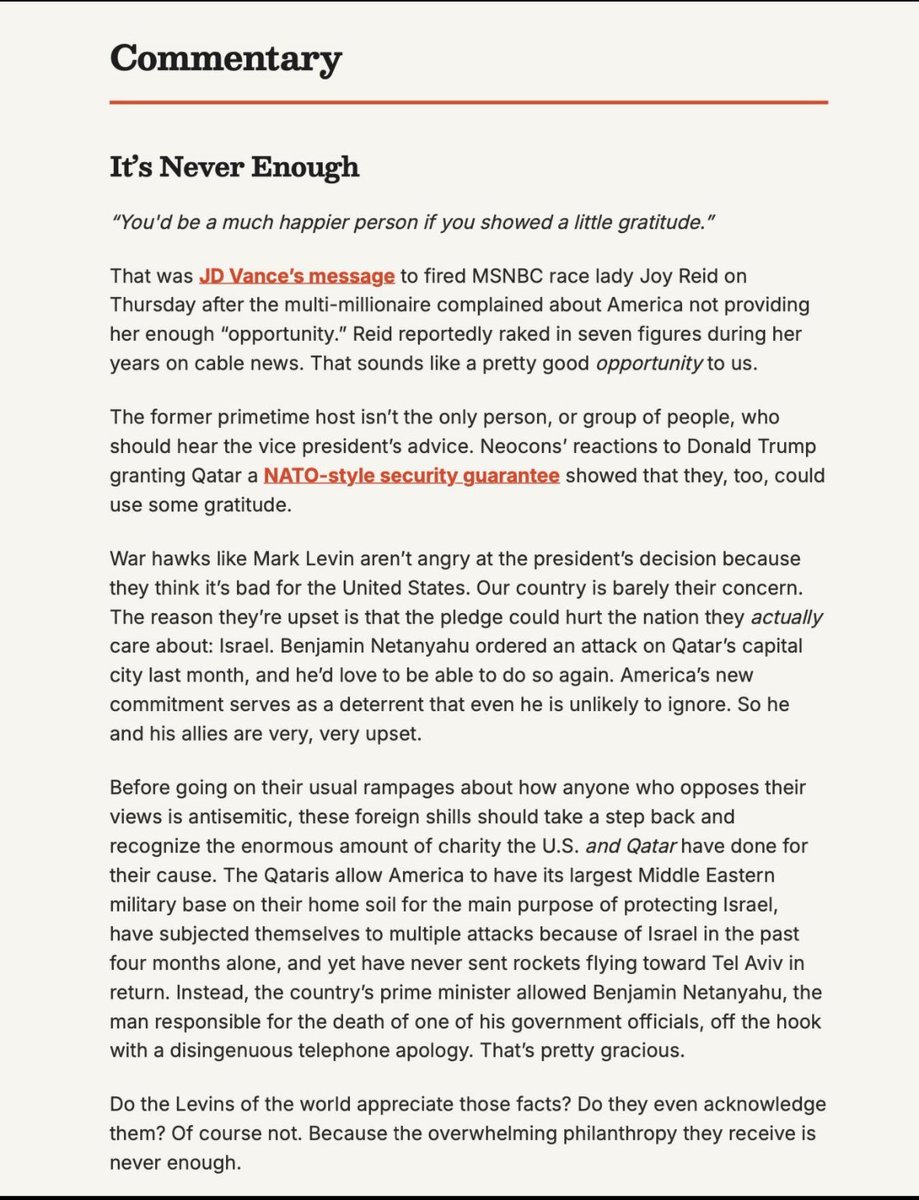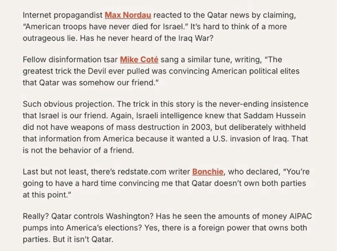 Very odd. Any explanations for why @TuckerCarlson would be bending over backwards to defend Hamas-sheltering, America-hating Qataris? 🤔