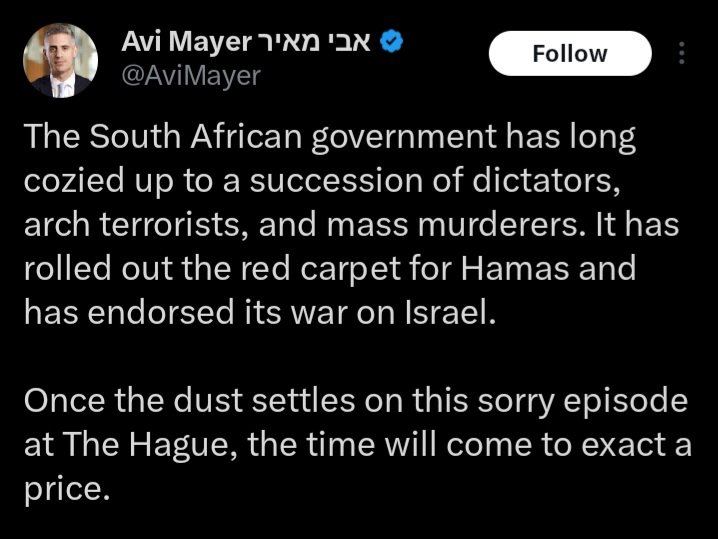The Former Editor-in-Chief of the Jerusalem Post threatening South Africa that Israel will "exact a price" from it tells you everything you need to know about how worried Israeli leaders are that they will be convicted of genocide at The Hague. https://t.co/l5gjXuCvOI