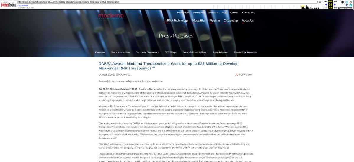 Never forget. "DARPA Awards Moderna Therapeutics a Grant for up to $25 Million to Develop Messenger RNA Therapeutics™ October 2, 2013 at 9:00 AM EDT" 404 on Moderna's site, so I found it for you. BTW, this has nothing to do with Project Stargate. Move along. https://web.archive.org/web/20200304182254/https://investors.modernatx.com/news-releases/news-release-details/darpa-awards-moderna-therapeutics-grant-25-million-develop/