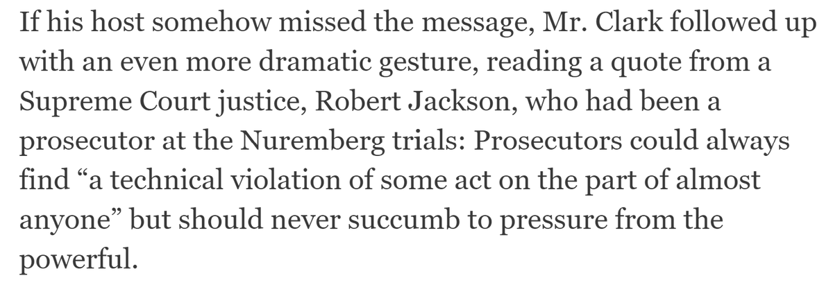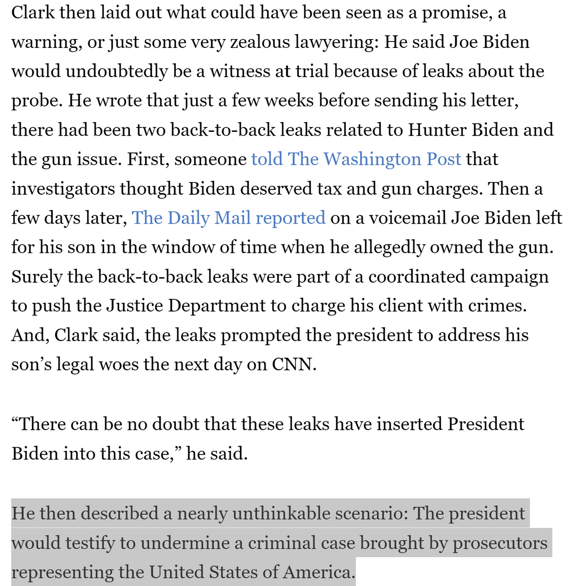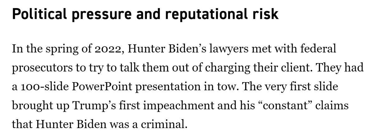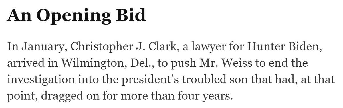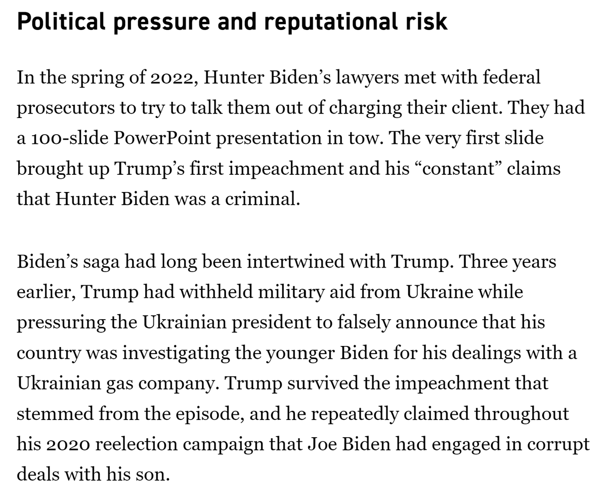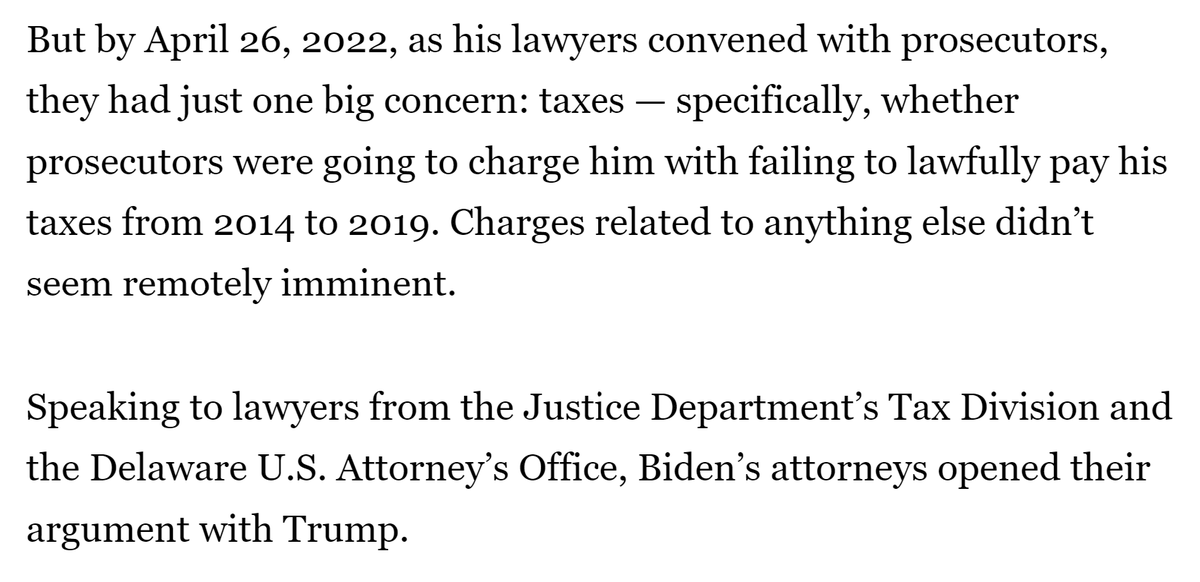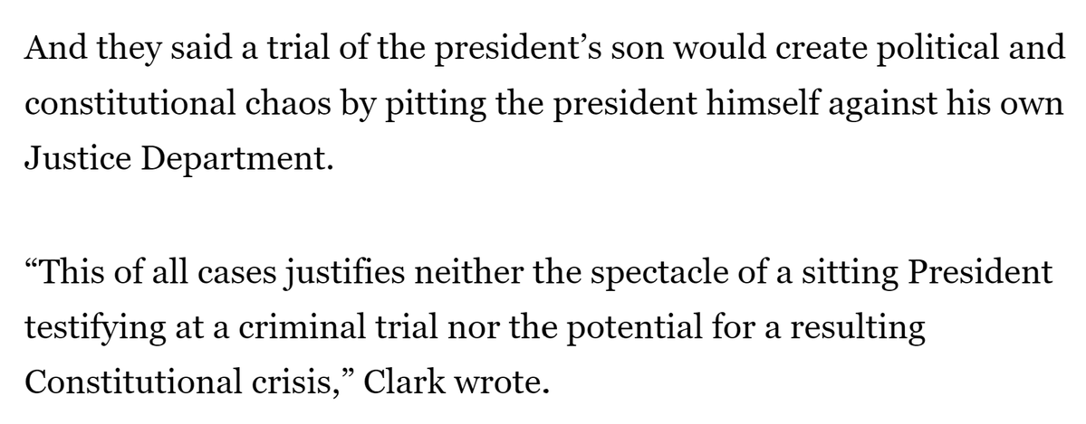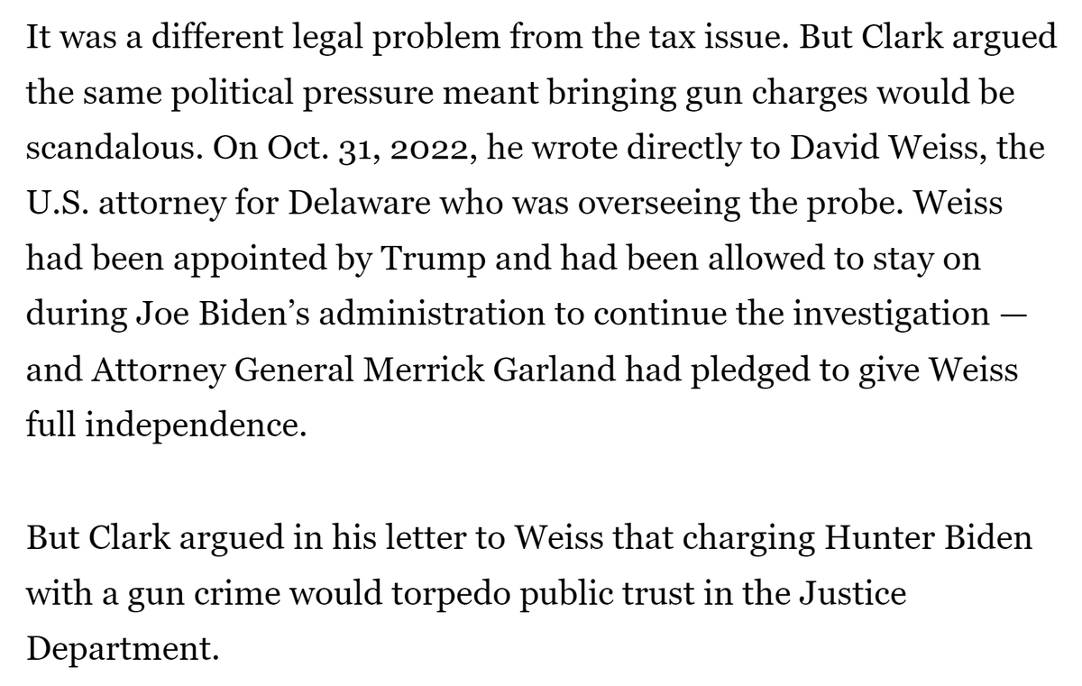 It cannot have been a coincidence that Chris Clark's letter to Weiss was on Oct. 31, 2022, the eve of the 2014-2015 tax charges expiring. It sounds from the Politico article that Clark cited the same things to Weiss he cited in his spring 2022 PowerPoint that *began* with Trump's impeachment. What better way to intimidate a very non-MAGA career official like Weiss than with the prospect that going to trial over the 2014 and 2015 years, presenting evidence on the Burisma and other foreign income, would inextricably tie you to an impeached former president on the VERY THING he was first impeached over--and that Joe Biden would put his finger on the scale by testifying to try and make you look like a conspiracy theorist in your case, which Clark said would "destroy the Justice Department’s reputation." To be clear, everyone I've talked to has pointed out that Joe Biden testifying wouldn't really help Hunter. But I think the threat of it in this context would have had an impact on Weiss. I also understand that: - Weiss had already previewed in the Oct. 7, 2022 meeting with IRS and FBI officials that he was likely to let the 2014-2015 tax charges against the President's son expire in Nov. 2022. Nevertheless, Clark's letter HAD to have sealed the deal. - Hunter's legal team had also expressed willingness to extend the statute of limitations tolling agreement (so as to avoid pushing prosecutors to make a decision to indict within the statute of limitations). Still, it's rather hard to believe a Washington Post article from three weeks earlier was the impetus for Clark's Halloween letter rather than to ensure the impending expiration of the 2014-2015 charges. - The Politico article presented Clark's letter in the context of the gun charge, and without seeing the letter it's hard to know for sure. /19
