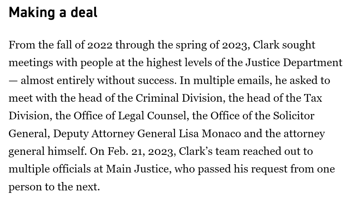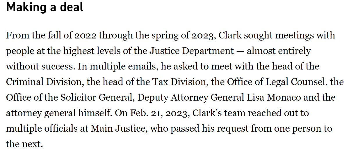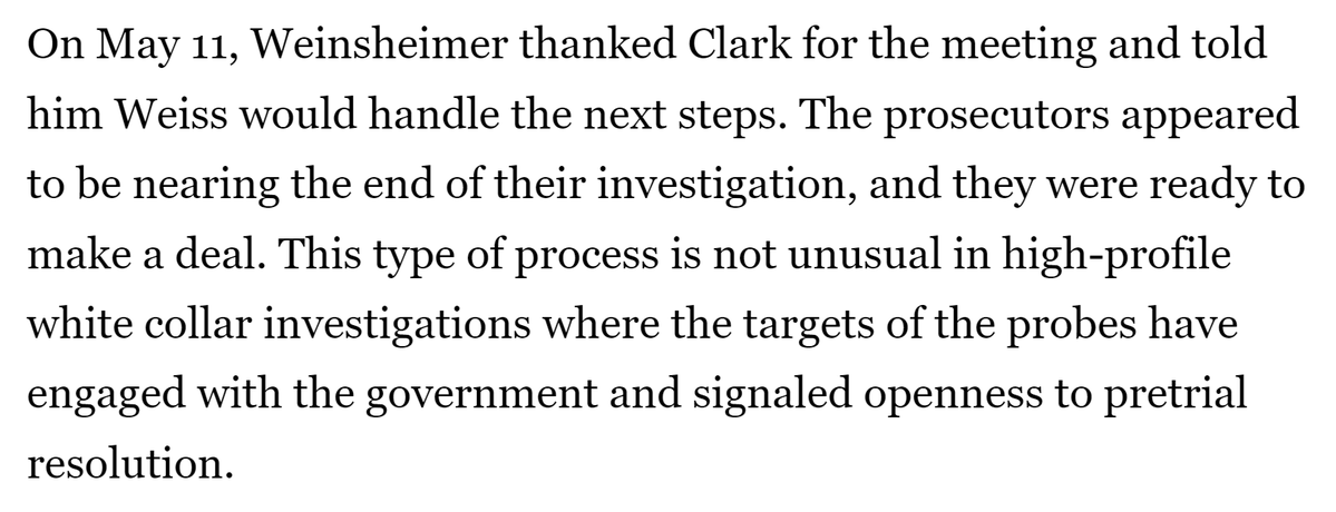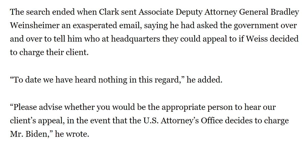 In case the letter to Weiss wasn't enough, Clark starts requesting in-person meetings. He gets one with Weiss in Jan. 2023, where the lawyer for the son of the most powerful man in the world tries to gaslight Weiss about where the true pressure to succumb was coming from. /12