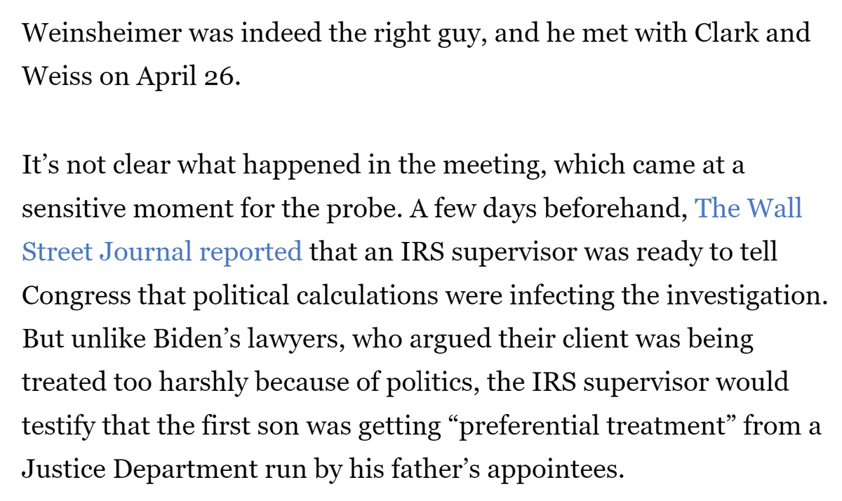 Notwithstanding what AG Garland had assured the American people about Weiss's independence, THE VERY NEXT WEEK after our letter, ADAG Bradley Weinsheimer bigfoots Weiss by making him take another meeting with Chris Clark--this time with Main Justice adding their pressure. /17 https://t.co/iI7rd15WKB