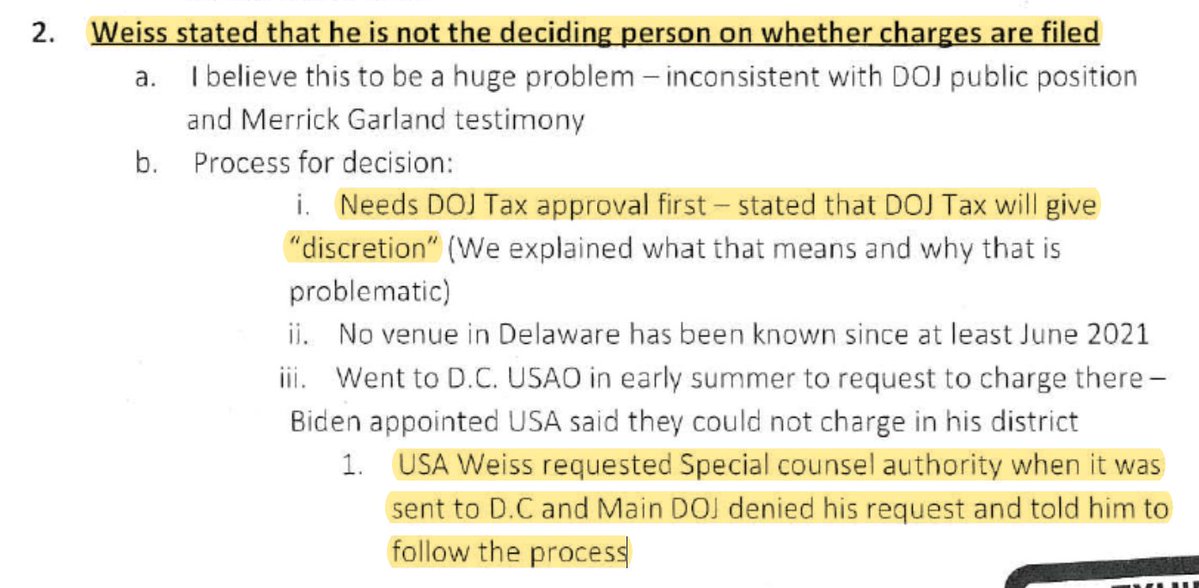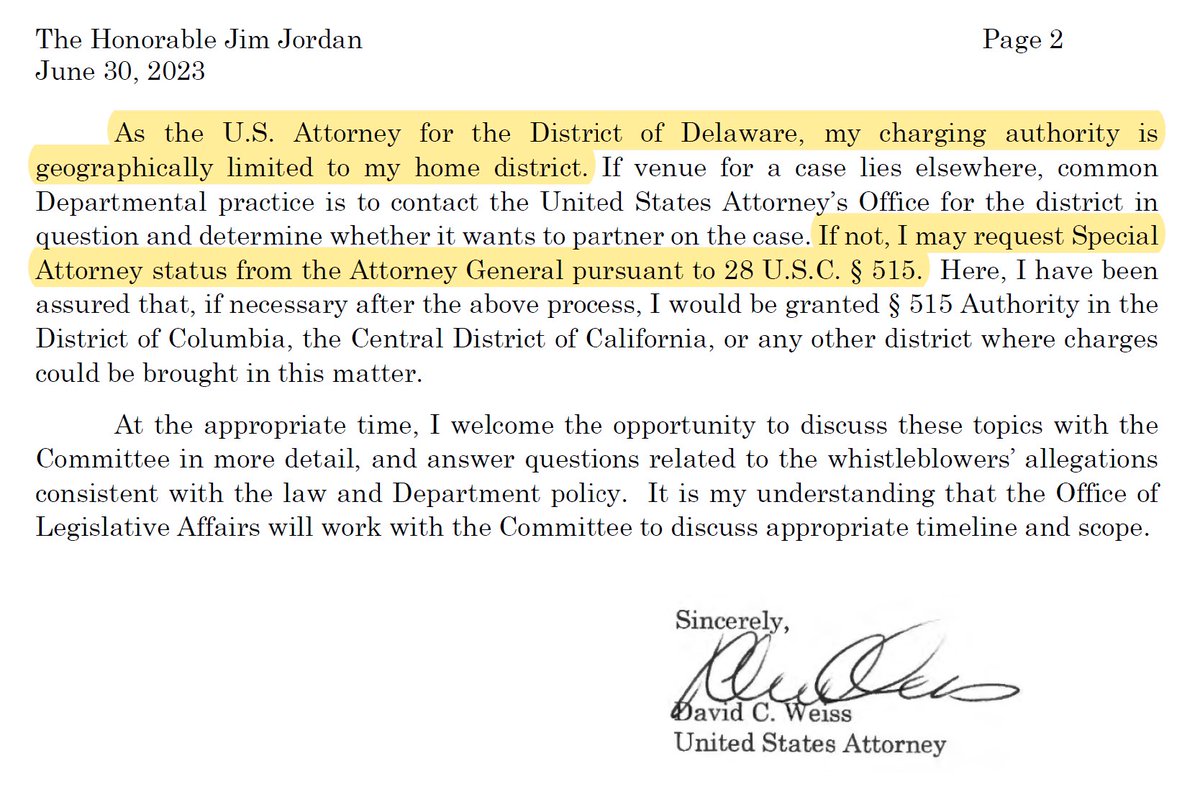 Presumably this awkward situation of not having DOJ Tax backing is why, around this timeframe, Weiss discussed with DOJ officials special charging authority. But being told "if it proved necessary" meant he had to "follow the process"--try to get other USAs to partner. /7
