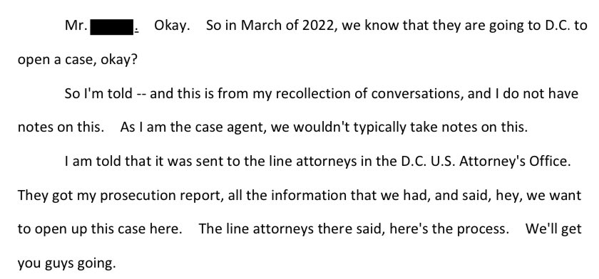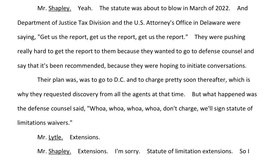 But as SSA Shapley has testified, the IRS’s goal was simply to pursue the investigation like they would any investigation, so besides commiserating with his counterparts at the FBI (who also expressed concerns), he tried to keep moving forward with the U.S. attorney’s office.