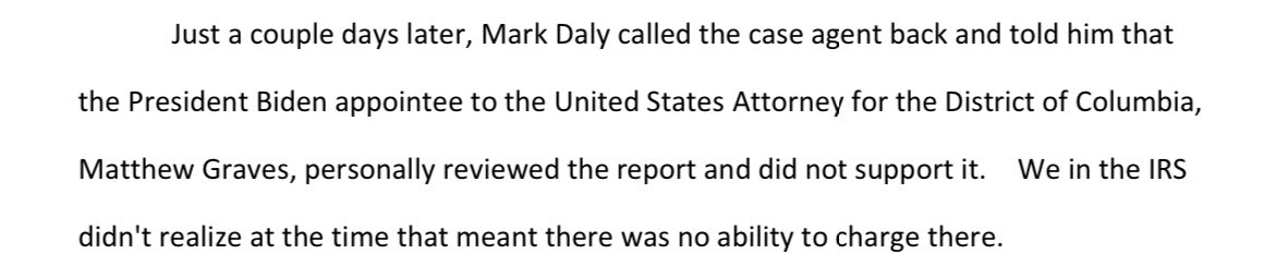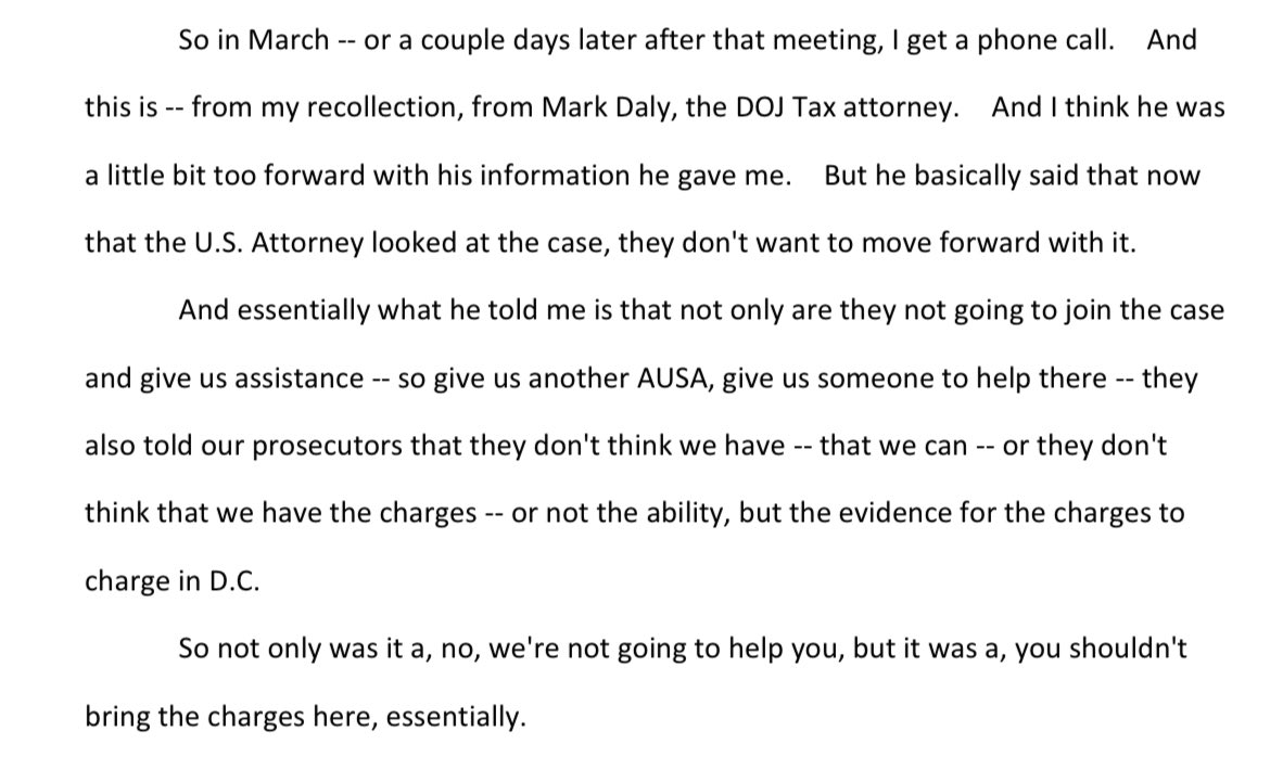 Consider this context when IRS investigators were told by DOJ Tax attorney Mark Daly that when the case was presented to the (career) 1st Assistant U.S. Attorney in D.C., she was optimistic about the case and agreed to partner with Delaware, saying she’d assign an AUSA to assist.