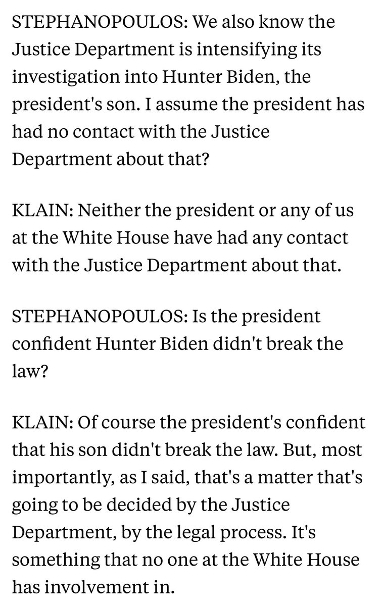 On 4/3/22 WH Chief of Staff Ron Klain reaffirmed Biden’s view: “The president's confident that his son didn't break the law.” He also said, “Neither the president or any of us at the White House have had any contact with the Justice Department about that.” https://abcnews.go.com/amp/Politics/week-transcript-22-white-house-chief-staff-ron/story?id=83832024