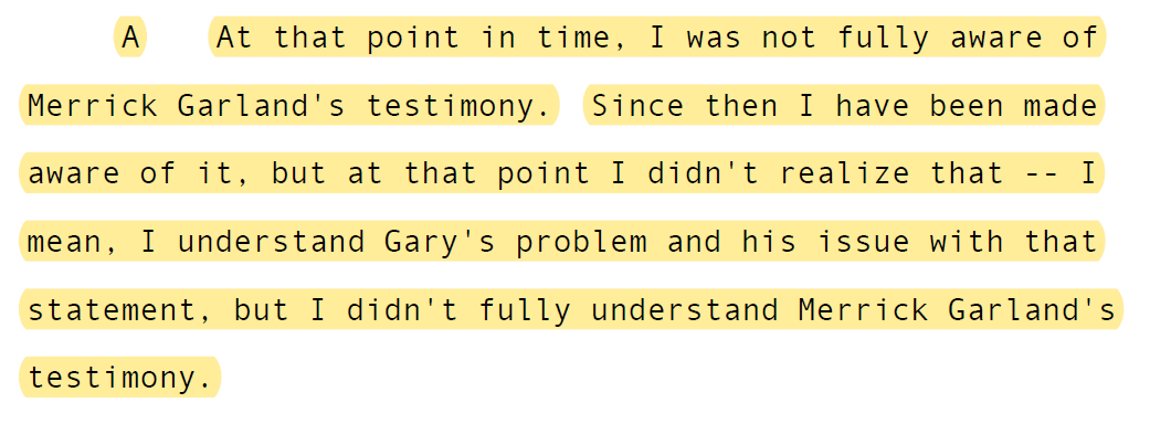 Waldon, the other IRS attendee at the 10/7/22 meeting, testified that unlike Shapley, he "hadn't seen Merrick Garland's testimony." Batdorf testified he wasn't fully aware of it either. And the FBI agents interviewed in the last week made no mention of the AG's testimony.