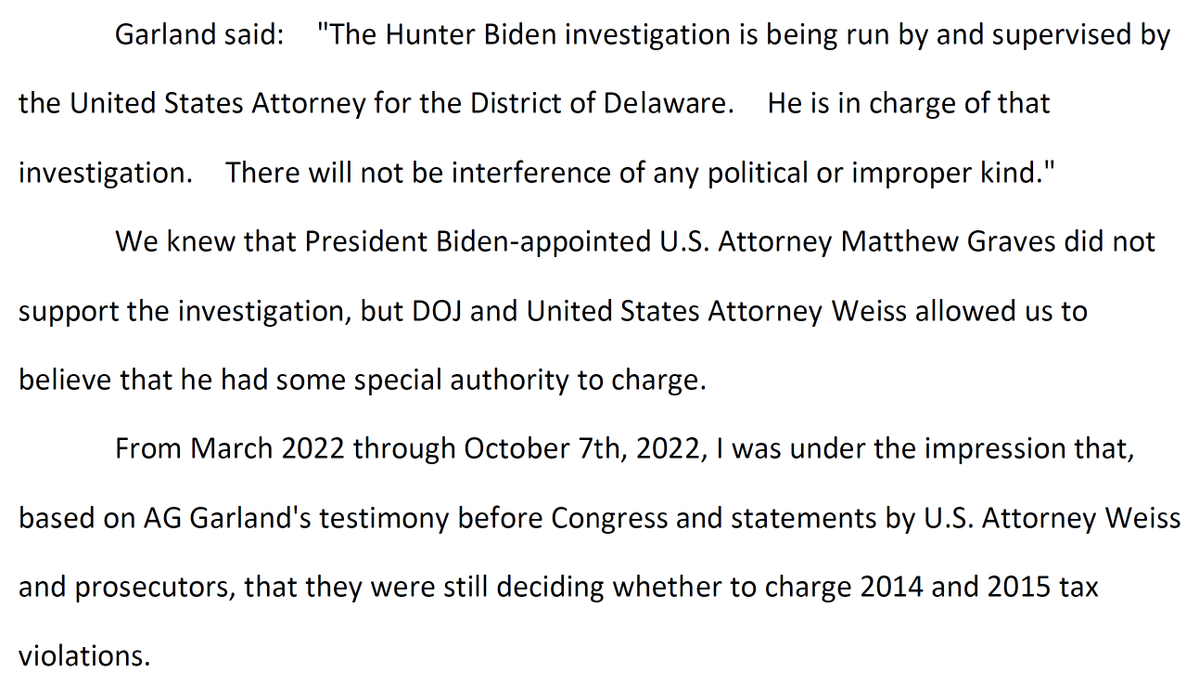 AG Garland's hearing testimony was key to IRS investigators believing U.S. Attorney Weiss had a path forward despite U.S. Attorney Graves overriding career officials in D.C. and declining the case. https://t.co/gRNPGPO78l