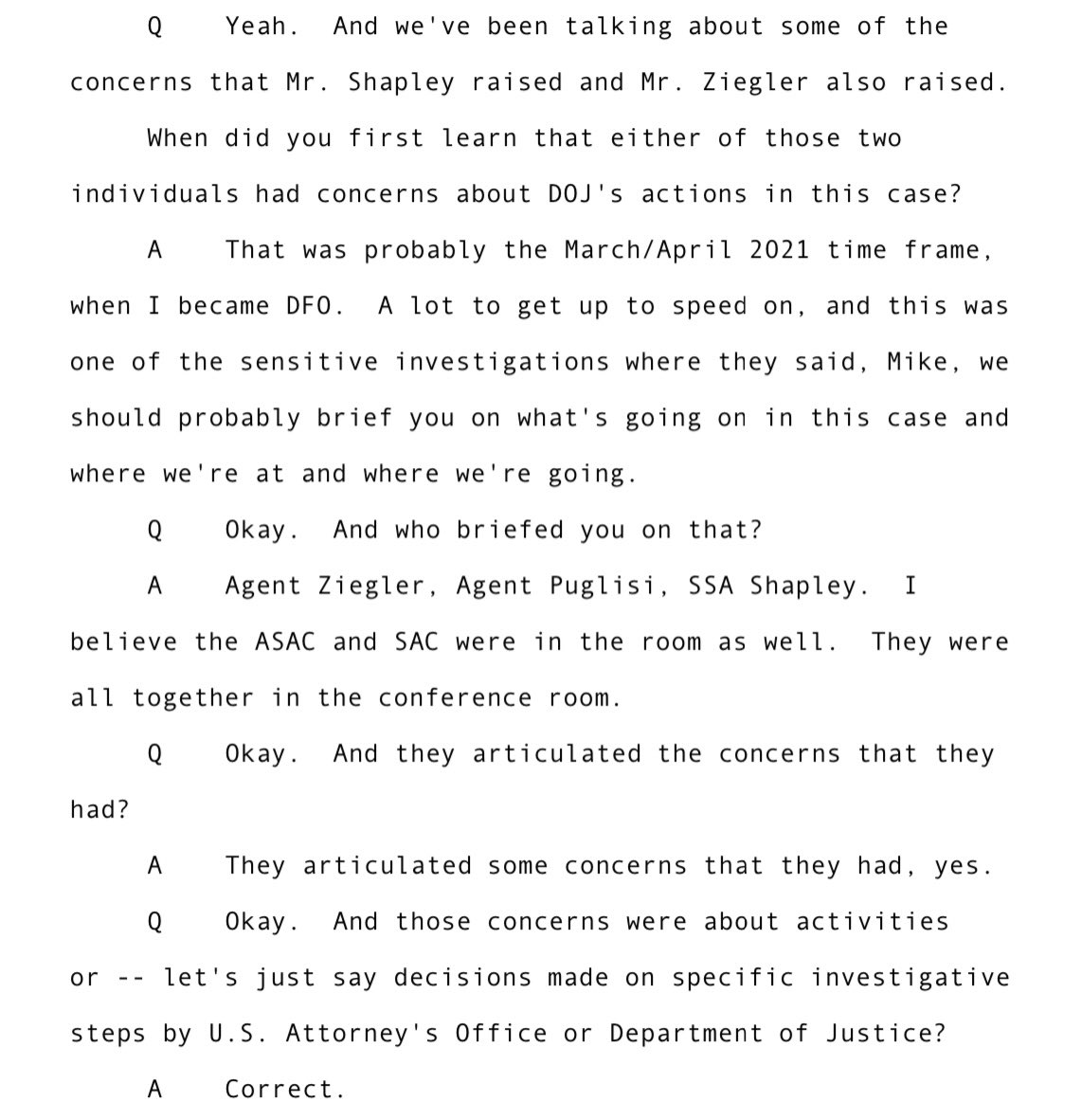 To go backwards in time, SSA Shapley made protected disclosures to his chain of command throughout the investigation into Hunter Biden. For instance, Mike Batdorf confirmed that Shapley disclosed his concerns when Batdorf became Director of Field Operations (DFO) in early 2021.