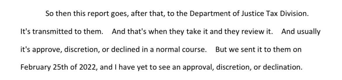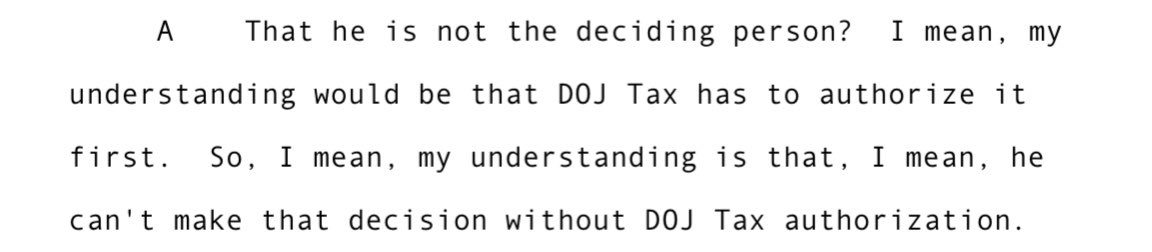 It’s important to understand that the first level at which decisions were out of U.S. Attorney Weiss’s hands was with the Tax Division at DOJ HQ, which never made a final decision on this case. As DFO Batdorf corroborated, DOJ Tax had to endorse the case for it to move forward.