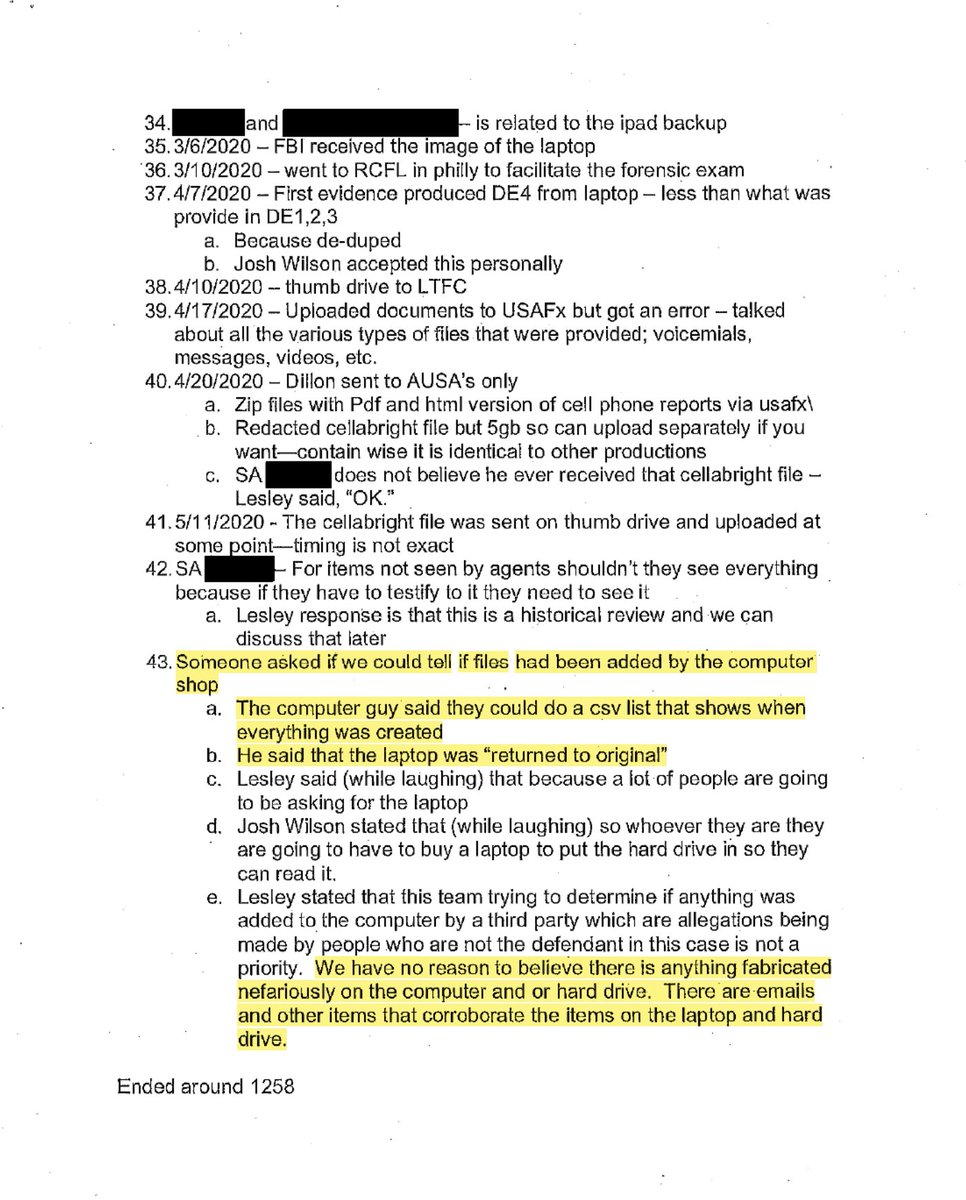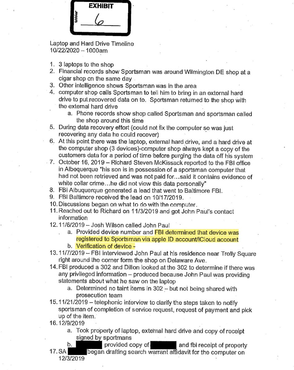 Start with this timeline provided by IRS whistleblower Gary Shapley. The FBI determined in November 2019 that the laptop was registered to Hunter Biden's Apple iCloud account. When the FBI took possession, they confirmed no files had been added to it. That was 11 months before the FBI contacted Facebook about suppressing the @nypost story. (Full transcript released by @WaysandMeansGOP here: https://waysandmeans.house.gov/wp-content/uploads/2023/06/Whistleblower-1-Transcript_Redacted.pdf.)