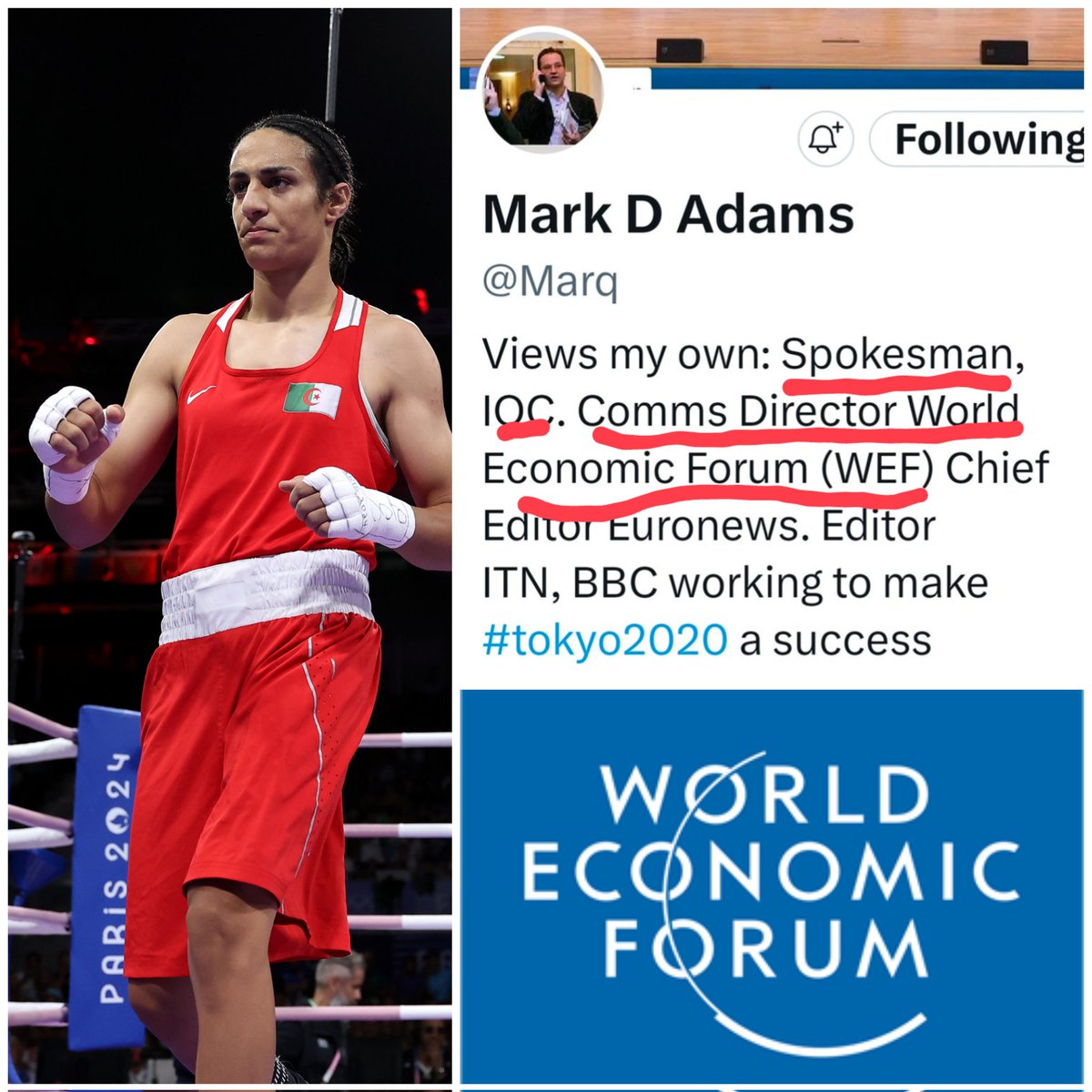 The Olympics spokesman who told us that Imane Khelif is legitimate "female" Well his day job is communications director for the World Economic Forum Are you paying attention yet? https://t.co/iSwiYwLFwv