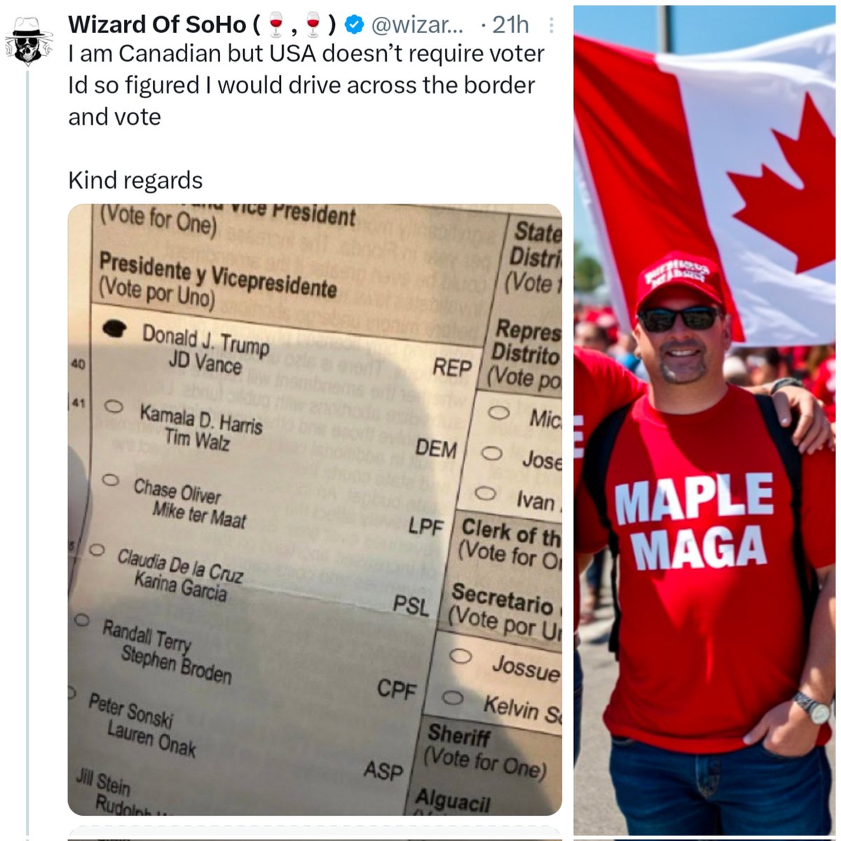 Canadians are crossing the border and illegally voting for Trump They found a loophole that allows them to vote in American elections because the United States famously has NO VOTER ID laws Anyone is allowed to vote in the US election. Including Canadians. https://t.co/8UWYBb1gWO