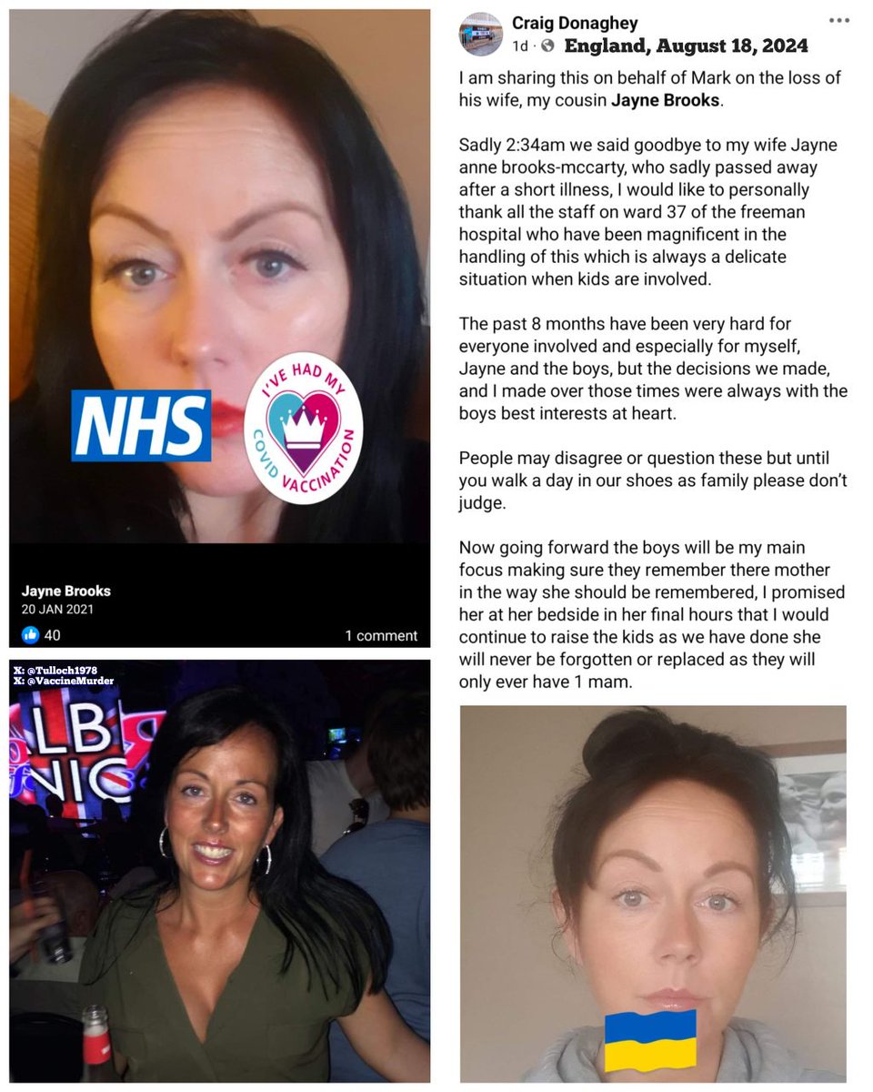 "I've Had My COVID Vaccination" #diedsuddenly (August 2024) "Sadly 2:34am we said goodbye to my wife Jayne anne brooks-mccarty, who sadly passed away after a short illness." https://t.co/jRdKdocHKe